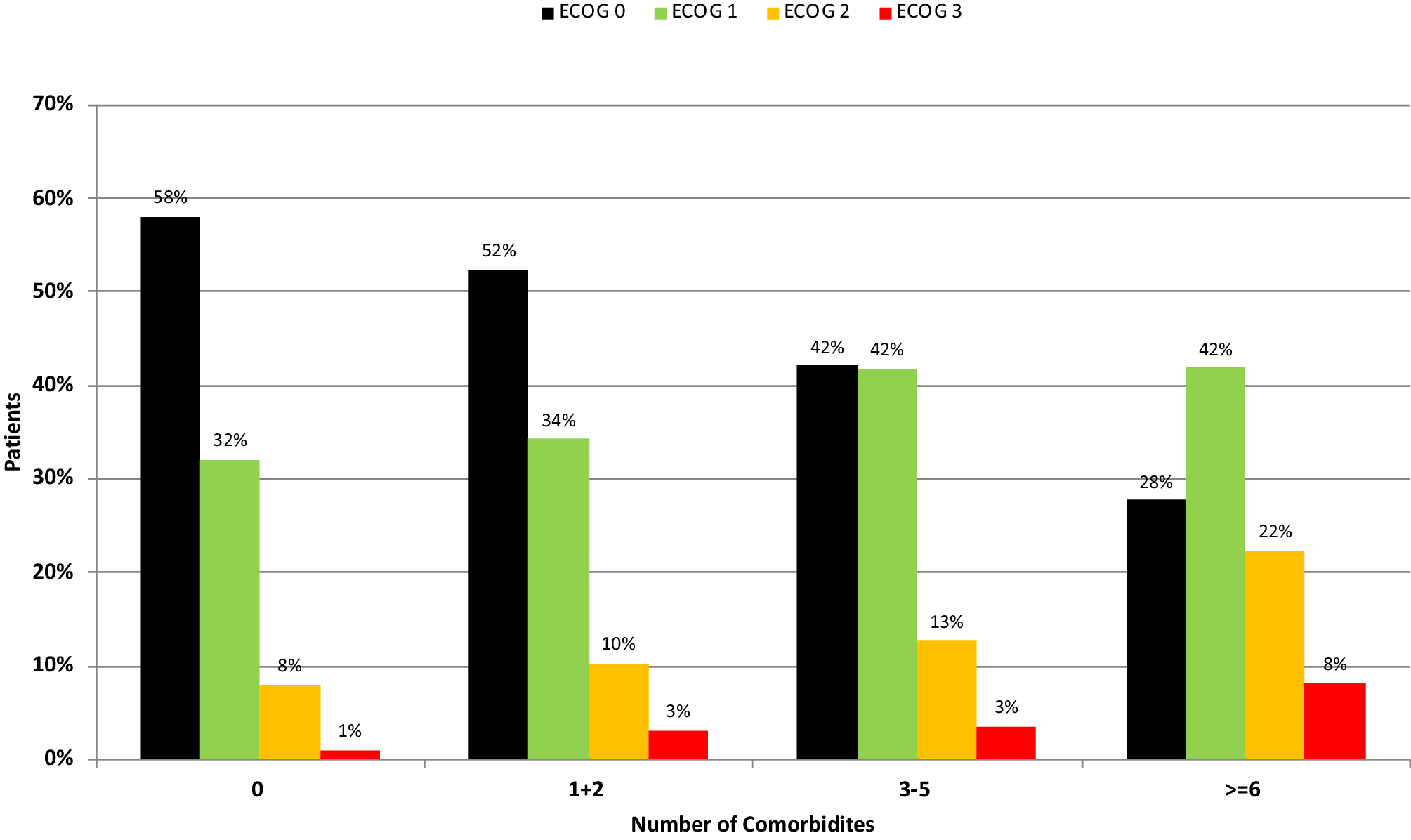 Distribution of ECOG status of patients (%) in relation to the numbers of comorbidities documented (these differences were statistically significant, chi-squared test p < 0.001). ECOG Eastern Cooperative Oncology Group