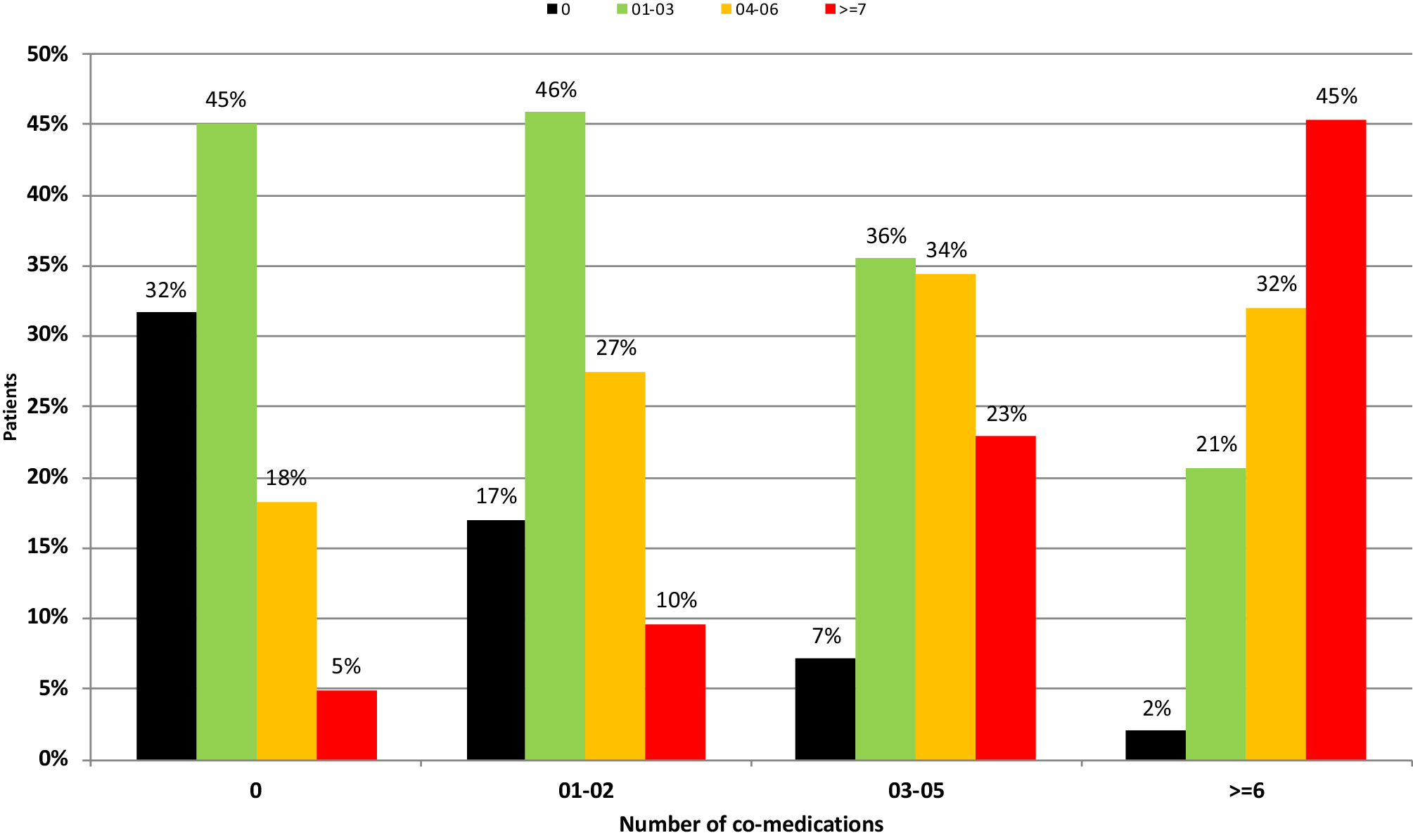 Number of medications prescribed in relation to the amount of comorbid conditions (these differences were statistically significant, chi-squared test p < 0.001)