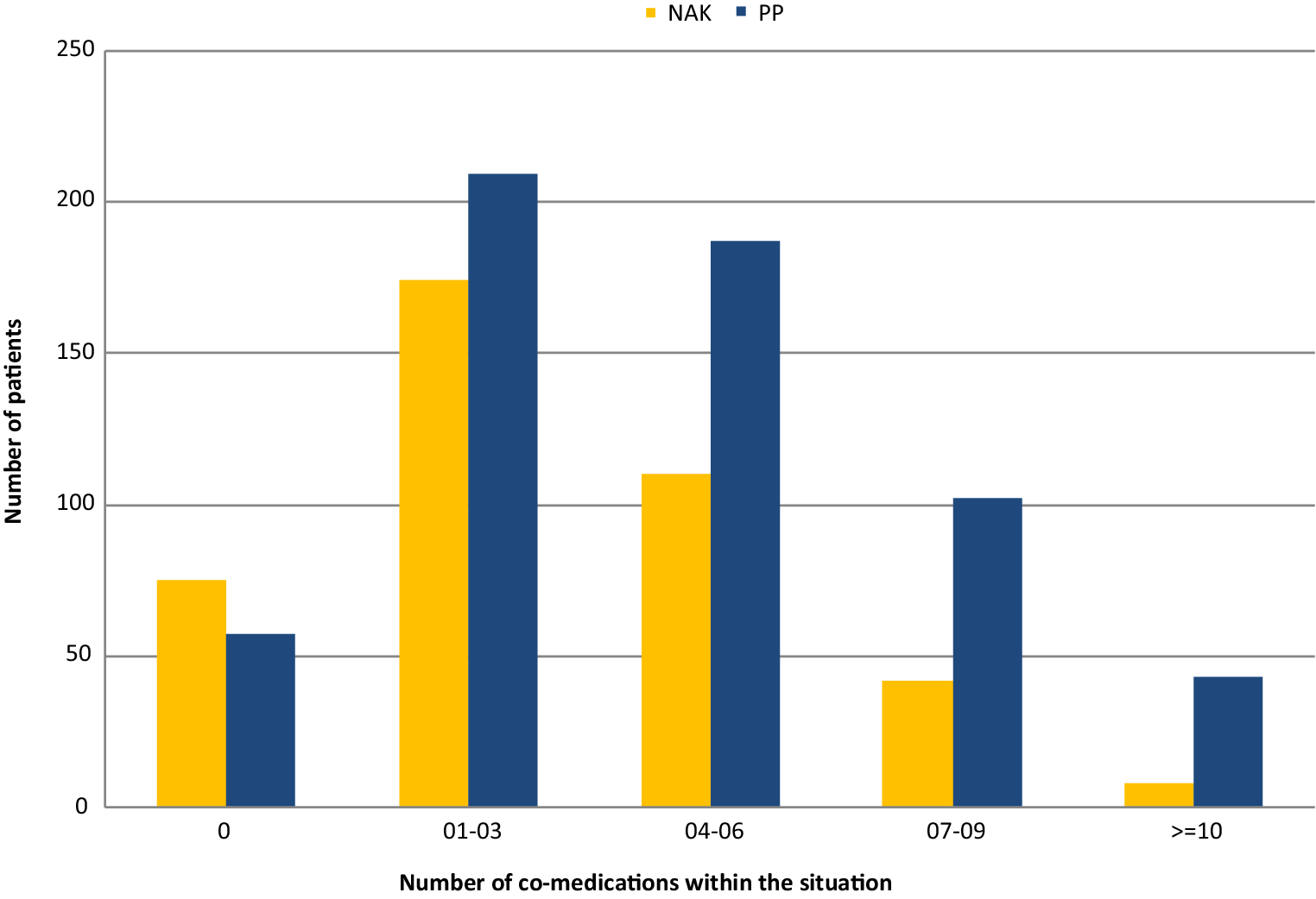 Concerning the cancer-specific treatment, 598 of the patients (58%) were allocated to receive palliative treatment, whereas for 409 patients (39%) the treatment was in adjuvant, neoadjuvant or curative intention. The remaining 29 patients (3%) were not clearly attributable to one of these treatment groups (e.g. definitive treatment with radiochemotherapy). The majority of patients treated (54%) were assigned to receive chemotherapy, regardless of the intention of treatment. Another 17% of the patients received a combination of chemo- and targeted therapy. Of the remaining patients, 14% were planned for targeted therapy alone and 17% for hormonal treatment. As indicated above, the majority of the patients (86%) allocated for treatment had at least one documented comorbid condition. Even patients with no comorbidity and with a good performance status, used medications other than those for cancer-specific treatment. We observed a significant correlation of number of medications prescribed in relation to the amount of comorbid conditions (chi-squared test p < 0.001, Fig. 3). Only 13% of the investigated population did not take any additional drug regardless of comorbidities and disease status. Patients who were assigned to get palliative tumour-specific treatment were more likely to have a higher number of comedications. There was a statistically significant increase in the number of medications prescribed in relation to the allocated cancer-specific treatment (chi-squared test p < 0.001; Fig. 4).