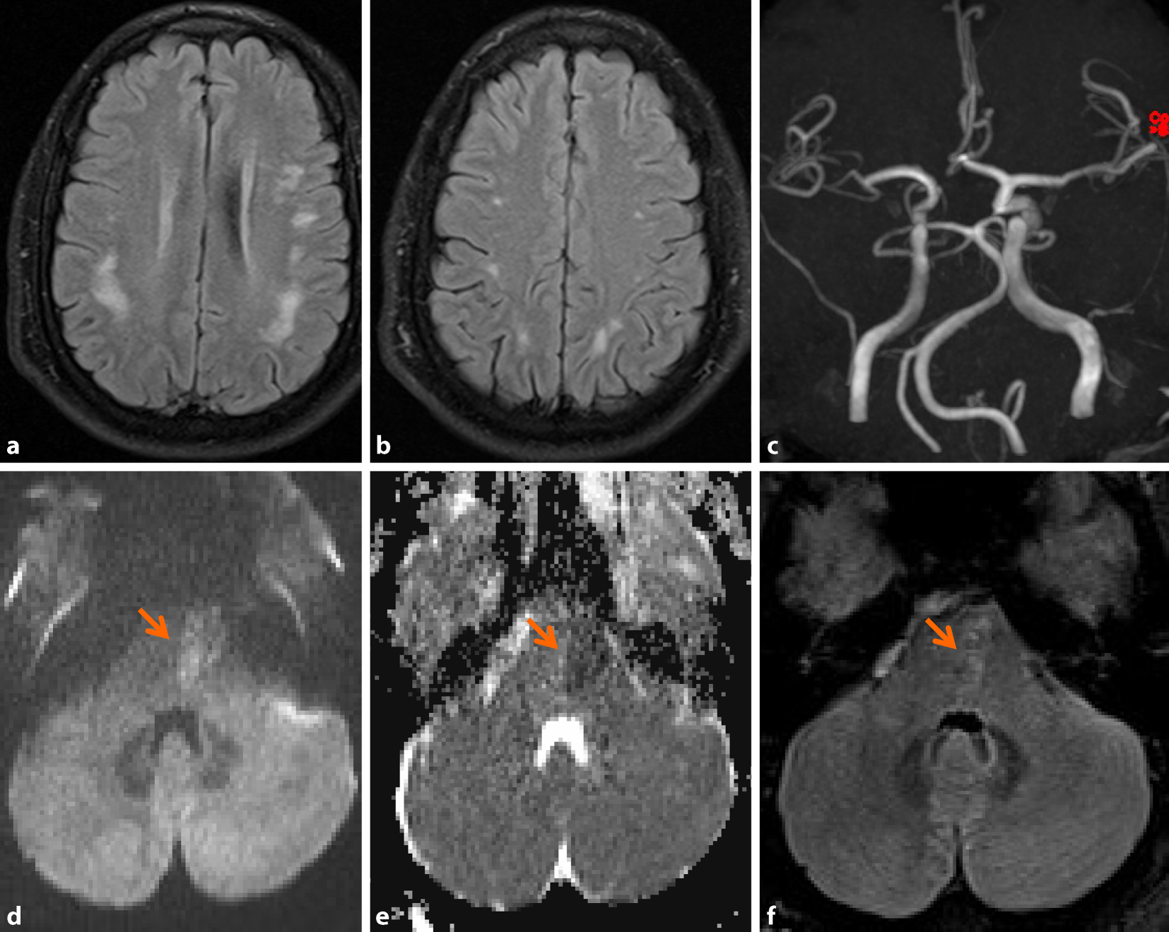 Zwei Tage danach entwickelte er erneut plötzlich eine sensomotorische Halbseitensymptomatik rechts sowie Dysarthrie. In der MRT kam nun ein rezenter ischämischer Infarkt im Pons paramedian links zur Darstellung (Abb. 1d–f). In der MR-Angiographie ergaben sich keine Hinweise für relevante Verschlussprozesse oder Aneurysmata, auch zeigte sich keine pathologische Kontrastmittelaufnahme. Klinisch präsentierte sich die Ausfallsymptomatik über Tage progredient mit Entwicklung einer höhergradigen Hemiparese rechts und ausgeprägter Dysarthrie. In einer weiterführend veranlassten Lumbalpunktion wurde eine lymphomonozytäre Pleozytose (20 Zellen/μl) mit leichter Schrankenfunktionsstörung nachgewiesen, oligoklonale Banden waren negativ. In einer umfassenden Erregerdiagnostik von Blut und Liquor cerebrospinalis (u. a. Bakterien- und Pilzkulturen, Borrelien, Lues, Virologie inkl. HIV und VZV [Varizella Zoster Virus]) fanden sich, wie auch in der transösophagealen Echokardiographie keine auffälligen Befunde. Zyto- sowie molekularpathologisch ergab sich kein Hinweis für Malignität.