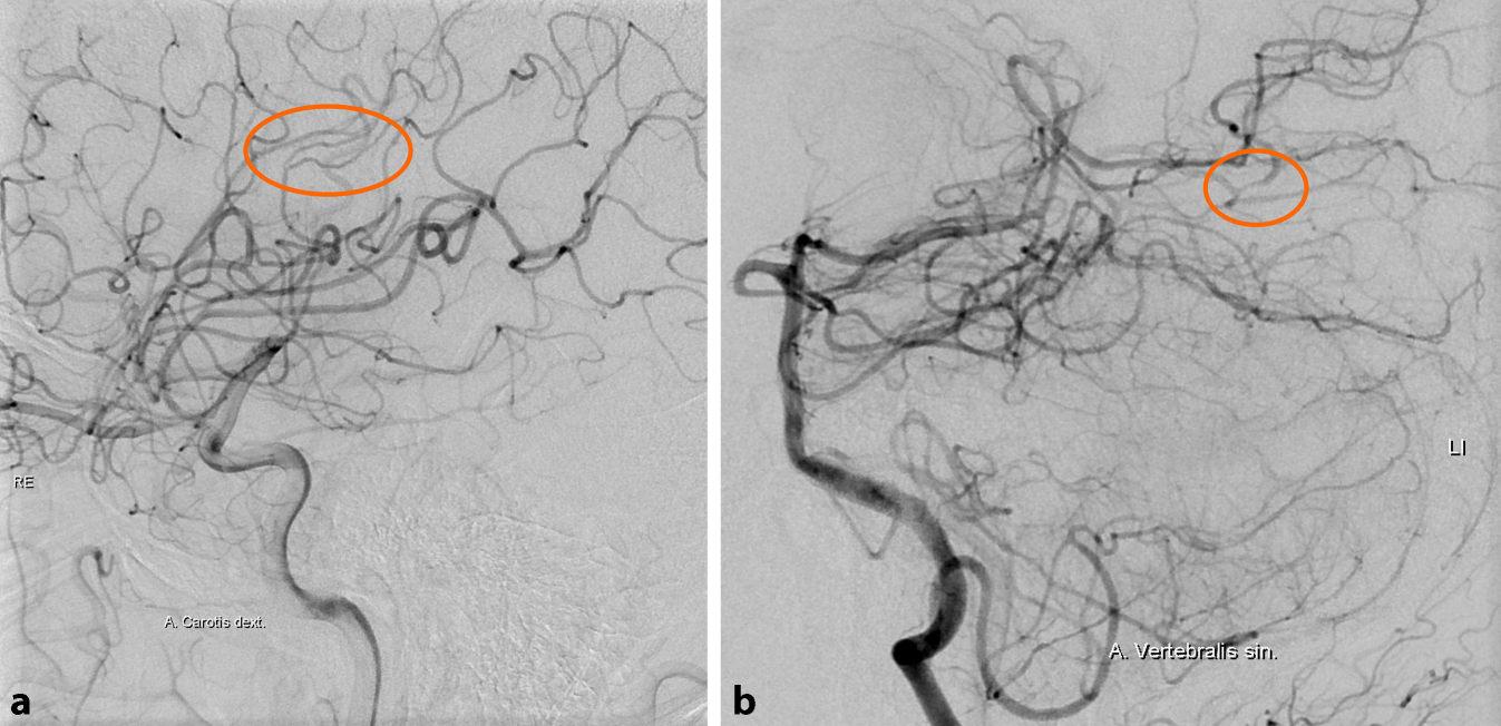 Aufgrund der vorliegenden Befunde wurde der Verdacht auf eine ZNS-Vaskulitis gestellt; da der Patient keine Anzeichen für eine systemische Vaskulitis hatte (keine Gelenks- oder Hautaffektion, unauffälliger ophthalmologischer Status, unauffälliges Labor inkl. immunpathologischem Serumprofil), wurde von einer isolierten ZNS-Manifestation (primäre Angiitis des ZNS) ausgegangen. Dieser Verdacht konnte in einer digitalen Subtraktionsangiographie, in der sich multisegmentale leicht- bis mittelgradige Kaliberirregularitäten in Gefäßabschnitten 3. und 4. Ordnung nachweisen ließen (Abb. 2), erhärtet werden. Schließlich konnte die suspizierte Diagnose mittels Hirnbiopsie bestätigt werden.