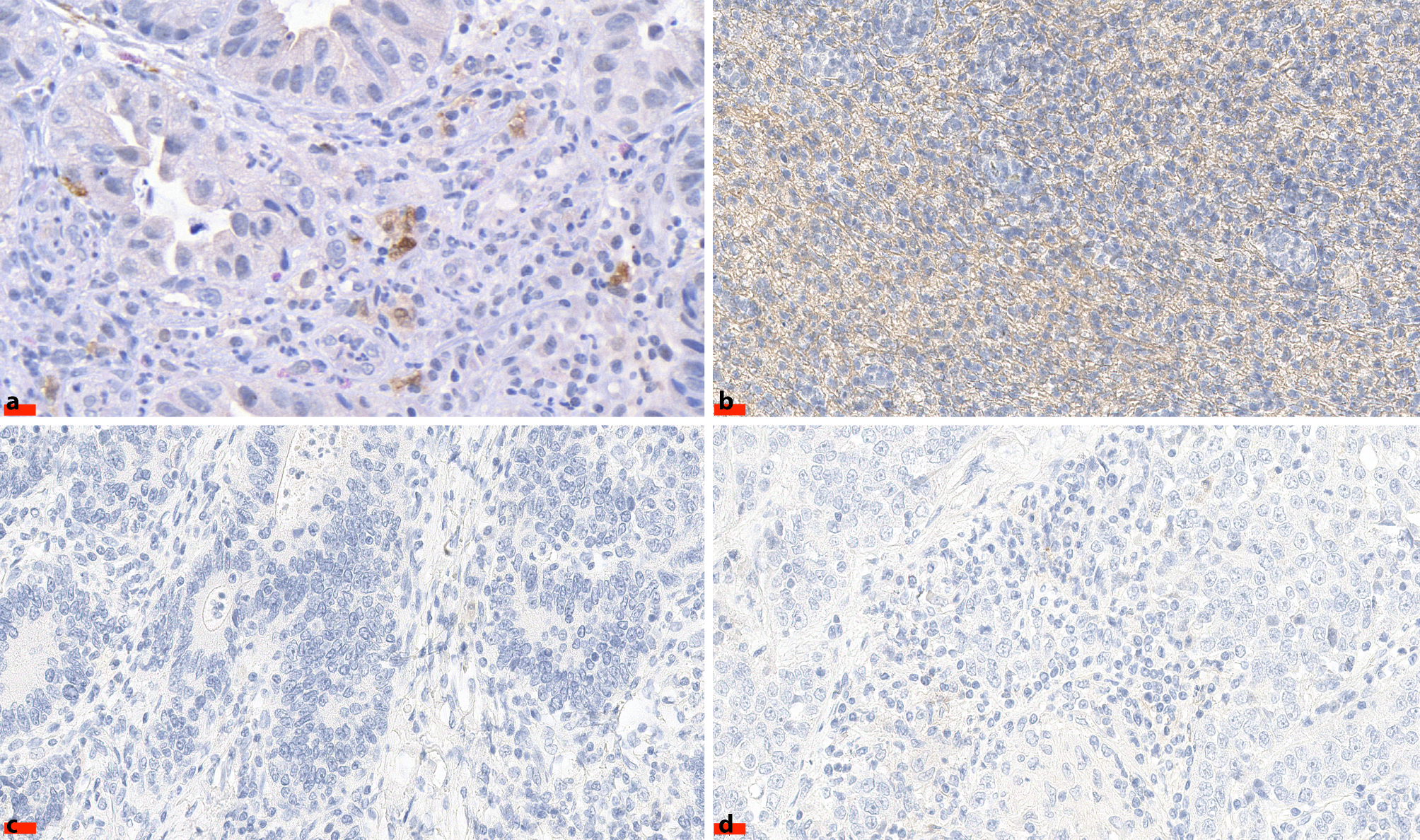 Representative images of diagnostic biopsies (a,b) and surgical specimen (c,d) of adenocarcinomas of the gastroesophageal junction stained for programmed death ligand 2 (PD-L2). a Positive signals of PD-L2 expression in cancer cells and b in tumor-infiltrating lymphocytes. c No signal or low expression of PD-L2 in cancer cells and d in tumor-infiltrating lymphocytes. Scale bar = 20 µm. Original magnification ×400 all