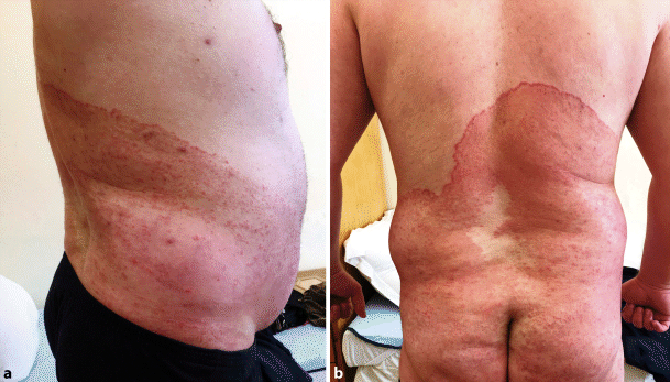 Dear Editors, we report a case of 36 year-old male military officer with progredient dermatophyte infection on cutis glabrea, with duration more than 3 months, currently affecting approximately 65 % of the skin surface (Fig. 1 and 1b). Lack of comorbidities and concomitant medication were reported. Increased disseminated sweating was reported by the patient, associated with the military service in the border regions of the Republic of Bulgaria. Trichophyton rubrum was identified as an infectious agent. A systemic therapy with terbinafine 250 mg was introduced in regimen once-daily for two months, combined with local therapy with fluconazole and prednisone containing extemporal forms. Complete remission was achieved with resolutions of the symptoms.