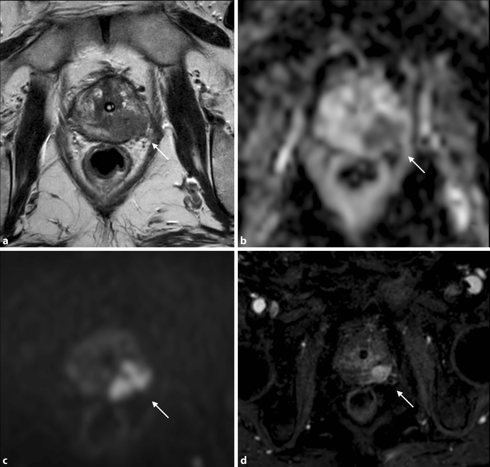 L’IRM multiparamétrique (IRMmp) montrant une lésion prostatique de la zone périphérique postéro-médiane gauche avec effraction de la capsule prostatique, classé Prostate Imaging Reporting and Data System (PI-RADS) 5. a Séquence anatomique en pondération T2 montrant la lésion sous forme d’une plage en hyposignal. b,c Séquences fonctionnelles de diffusion (ADC et high b‑value DWI) avec hypointensité de signal en ADC et hyperintensité en high b‑value DWI. d Séquence de perfusion dynamique (dynamic contrast enhancement – DCE), montrant un rehaussement intense et précoce de la lésion