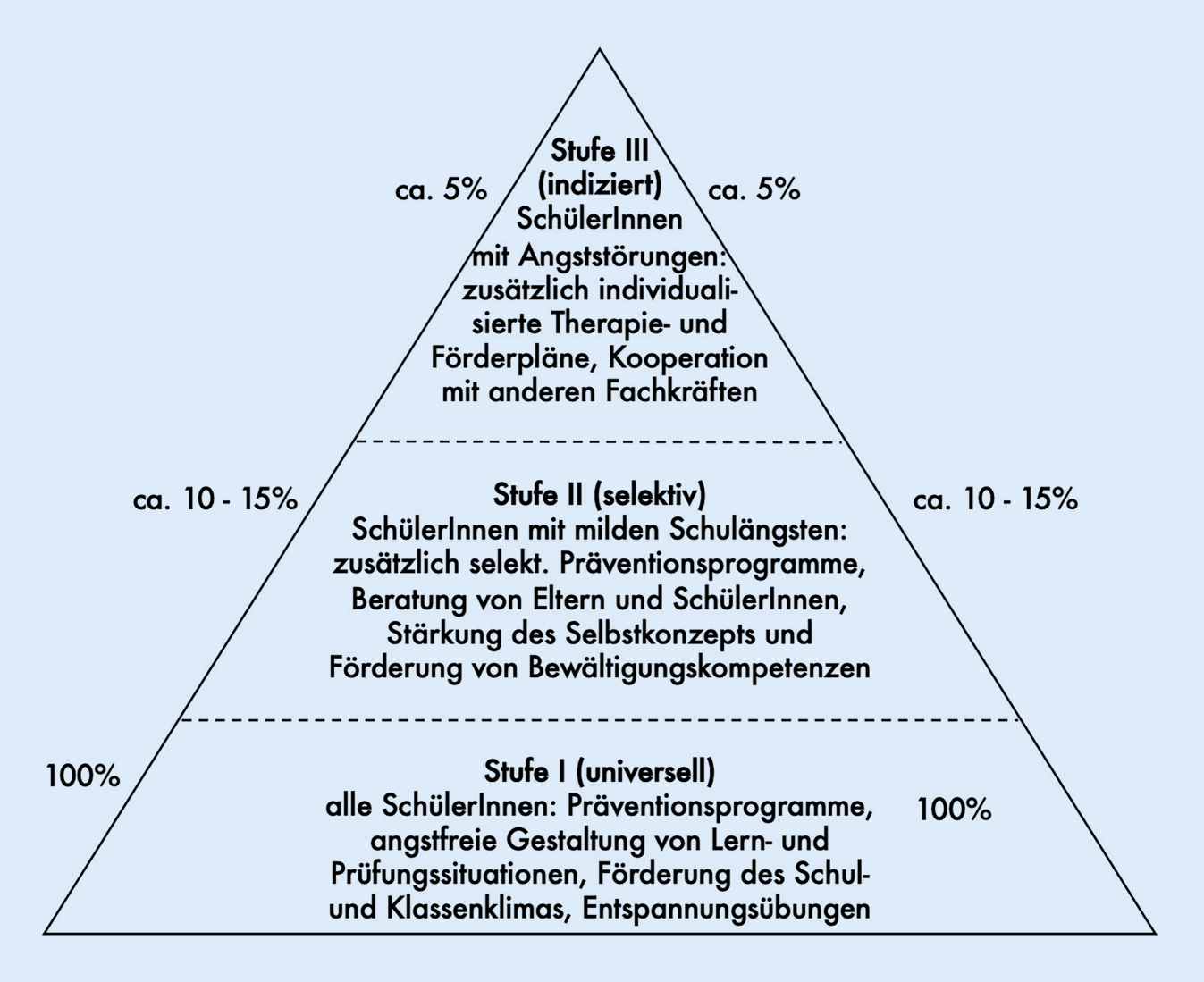 Am Beispiel von Schülerängsten lässt sich aufzeigen, wie bei einem gestuften Vorgehen universale, selektive und indizierte Maßnahmen miteinander kombiniert werden können (Abb. 1).