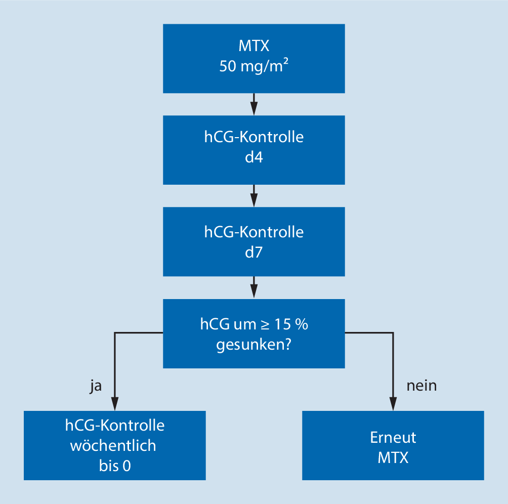 Das konkrete klinische Vorgehen im Single-dose-Schema mit 50 mg/m2 MTX intramuskulär wird in Abb. 2 dargestellt. Wird eine PUL oder ektope Schwangerschaft mit Methotrexat therapiert, sind anschließend wöchentliche hCG-Kontrollen bis zur Negativierung nötig.