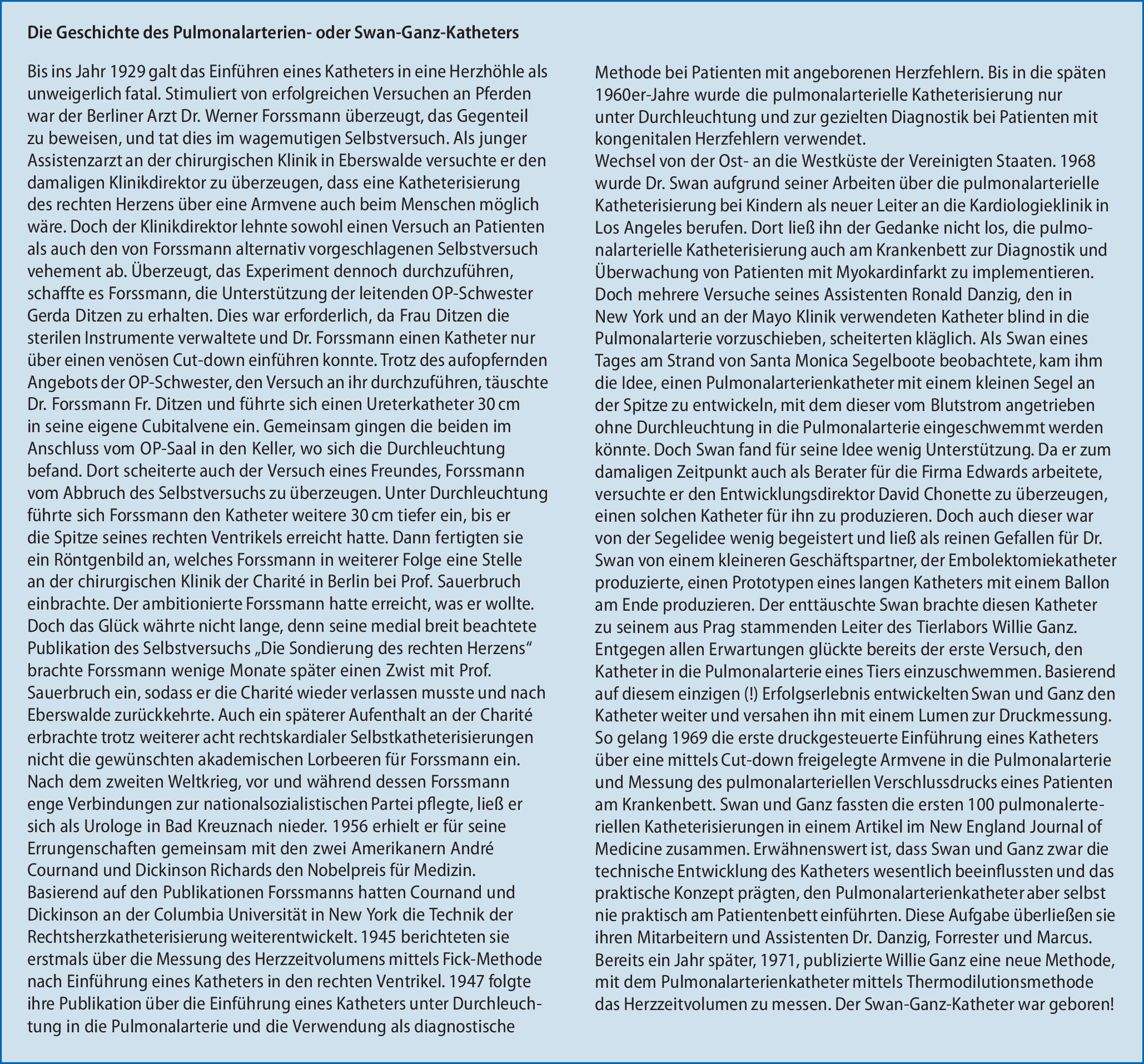 Kurze Zeit nach seiner Entwicklung (siehe Abb. 1 zu den historischen Fakten) und Publikation der ersten Anwendungen an kardiologischen Patient:innen [3] kam es zur rasanten Verbreitung des PAK zu diagnostischen Zwecken bei kardiologischen Patient:innen sowie als hämodynamisches Monitoringverfahren bei chirurgischen Patient:innen mit hohem perioperativem Risiko und kritisch kranken Patient:innen auf der Intensivstation. Ende der 1980er-Jahre wurden 0,5 % aller internistischen Krankenhausaufnahmen bzw. 20–40 % aller kritisch kranken Patient:innen mit einem PAK monitorisiert [4]. Bereits Ende der 1970er-Jahre wurde über Komplikationen durch den PAK berichtet. Diese umfassten nicht nur Herzrhythmusstörungen (allen voran Extrasystolen), sondern in schweren Fällen auch mechanische Komplikationen (zum Beispiel eine Verknotung des Katheters) bzw. Schäden am rechten Herzen und den Pulmonalarterien, Endokarditiden und höhergradige AV-Blockaden [5]. Erste größere Observationsstudien Mitte der 1990er-Jahre legten nahe, dass kritisch kranke Patient:innen, die mit einem PAK monitorisiert waren, mehr Komplikationen und eine höhere Sterblichkeit aufwiesen als Patient:innen ohne PAK-Monitoring [6]. Randomisiert kontrollierte Studien konnten eine solche Mortalitätssteigerung durch den PAK zwar nicht nachweisen, zeigten aber auch keinen Überlebensvorteil durch seine Anwendung bei perioperativen, nicht-kardiochirurgischen Patient:innen [7], nicht-schockierten Patient:innen mit akuter kardialer Dekompensation [8], heterogenen Populationen kritisch kranker Patient:innen [9‐11] oder bei Patient:innen mit akuter Lungenschädigung [12].