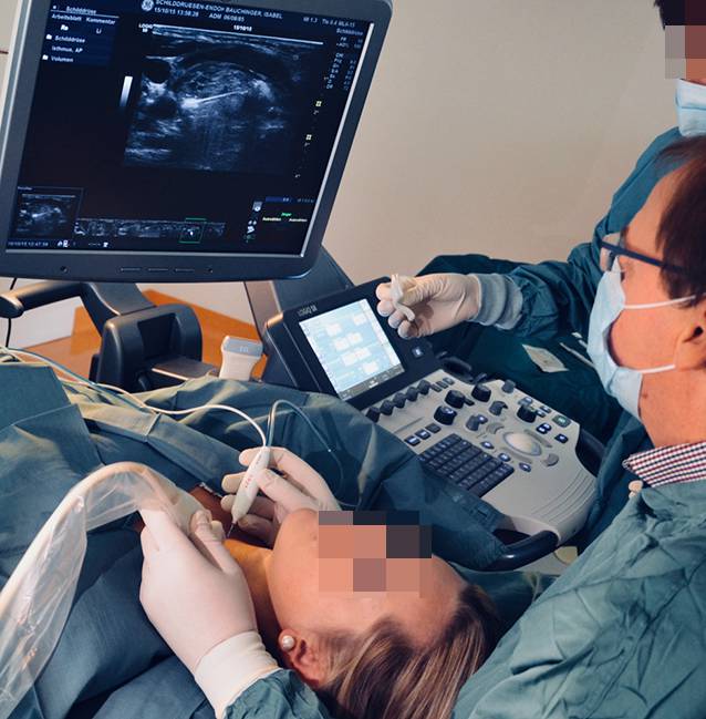 Typisches Setting bei einer Radiofrequenzablation eines Schilddrüsenknotens. Der Arzt sitzt an der Kopfseite des Patienten, den Monitor direkt vor Augen, arbeitet idealerweise in dieser Position Knoten zu beiden Seiten ab. Eine Assistenz monitorisiert den Patienten und bedient den Hochfrequenzgenerator, die zweite assistiert direkt dem Arzt. Ein typischer Eingriff dauert 30 min, gefolgt von einer Nachbeobachtungszeit