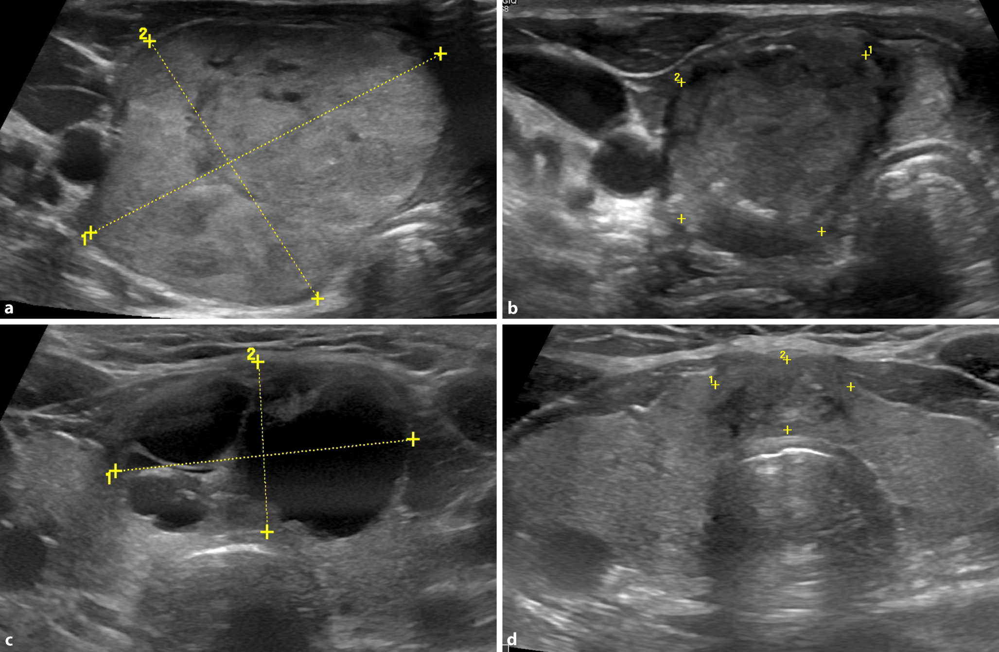 a und b Beispiel einer Radiofrequenzablation (RFA) eines soliden Knotens vor und 12 Mon. nach der Behandlung. a 50-jährige Patientin, 5‑facher Volumenzuwachs des Knotens in 8 Jahren, mehrfache Operationsempfehlung, visuell der Knoten deutlich sichtbar, Symptomatikscore 4 von 10; Knotenvolumen: 40 ml. b Nach 12 Monaten der Knoten nur noch palpabel, Symptomatikscore 0, Knotenvolumen 8,2 ml (−80 %). Dieses Beispiel zeigt auch, dass das exakte Setzen der Messmarken, die sich an der initial längsten Querachse orientieren, wichtig ist für die Erfassung des Verlaufs des Knotenvolumens. c und d Beispiel einer RFA eines zystischen Kolloidknotens. c Prätracheales, kompensiertes zystisches autonomes Adenom, hochvisköser Inhalt, Knotenvolumen 10,6 ml, TSH 0,6 uU/ml, Symptomatikscore 4 (von 10), visueller Knotenscore 3 (von 3), Operation empfohlen. d Nach 12 Monaten visueller und Symptomatikscore 0, transformiertes Knotenrestgewebe 1,2 ml (−89 %), TSH 1,0 uU/ml