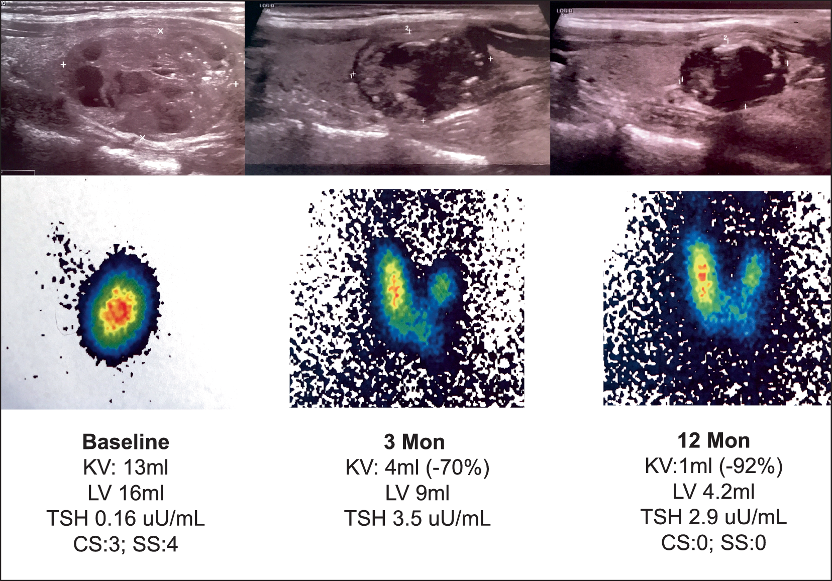Beispiel einer Radiofrequenzablation (RFA) eines autonomen Adenoms. 48-jährige Patientin, autonomes Adenom seit Jahren bekannt, zuletzt deutliches Wachstum und Entwicklung einer latenten Hyperthyreose. Operation wurde empfohlen. Der Ausgangsbefund ist ein 13 ml großes, 40 % zystisches, autonomes Adenom, welches den Großteil des linken Schilddrüsenlappens einnimmt, funktionell dekompensiert. Die Ultraschallbilder zeigen den Sagittalschnitt durch den linken Schilddrüsenlappen mit den morphologischen Veränderungen 3 und 12 Monate nach der RFA. Da das behandelte autonome Adenom nach der RFA bindegewebig umgebaut wird, wird aus dem in der Technetium-99m-Szintigraphie vormals „heißen“ Knoten ein „warmer“ oder idealerweise sogar ein „kalter“ Knoten. KV Knotenvolumen, LV Lappenvolumen, CS visueller Knotenscore (bis Grad 3); SS Symptomatikscore (bis Grad 10)