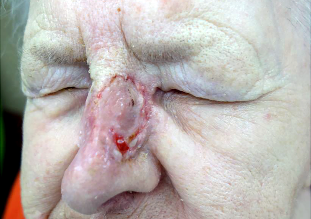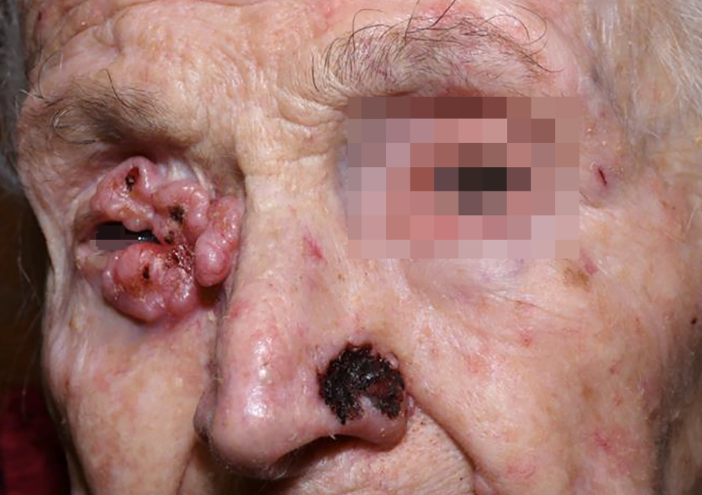 Patient 1: expansive basal cell carcinoma at the inner corner of the right eye and another lesion on the left nasal wing