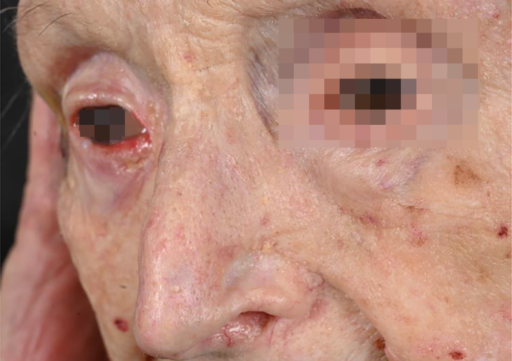 The first patient was initially seen in February 2022 at the age of 96. Completion of the diagnostic workup was deferred due to her advanced age. In 2023, when a full diagnosis was finally made, the patient had an expansive BCC at the inner corner of her right eye, which, according to computed tomography (CT), had spread to the nasolacrimal duct but not to the bone (Fig. 1). Another lesion was present at the left nasal wing. Punch biopsies confirmed the diagnosis of BCC in both areas. The patient had hypertension and Parkinson’s disease, which were treated with appropriate medication.