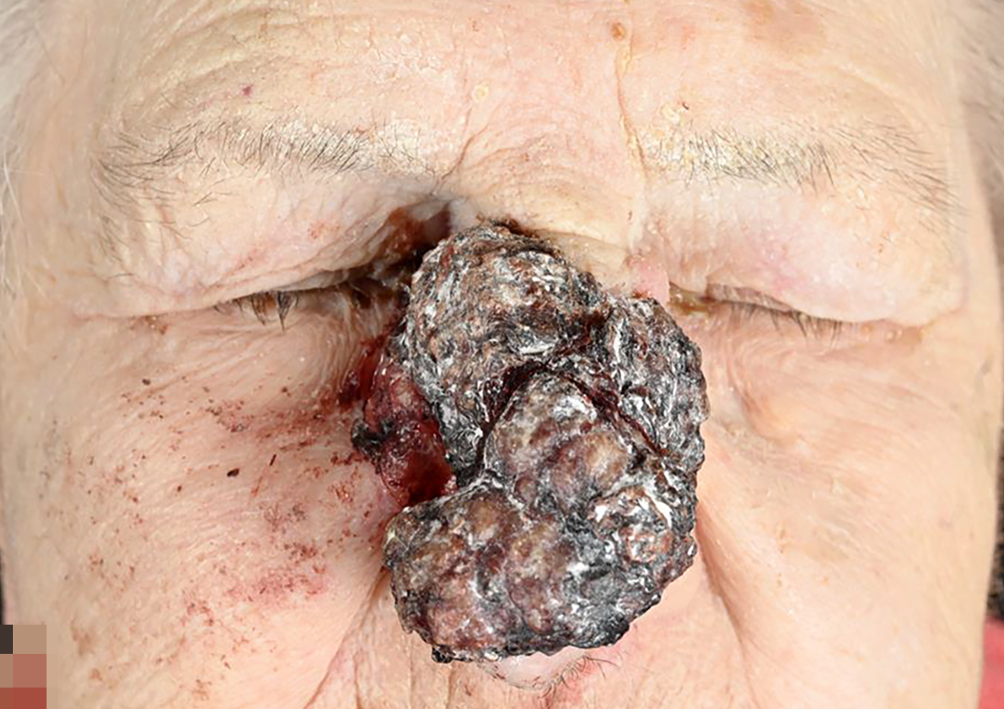 Patient 2: huge recurrence of a basal cell carcinoma that had been removed from the bridge of the nose 20 years previously