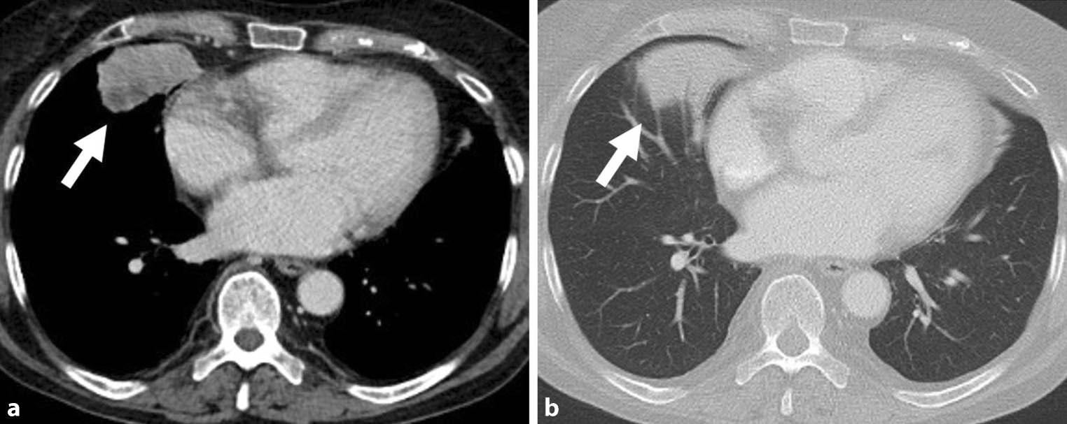 Radiological features of primary pulmonary sarcoma (PPS): Contrast-enhanced computed tomography (a soft tissue window, b lung window) shows a subpleural lesion in the medial segment of the middle lobe with a dimension of 5.5 × 4.4 cm (arrow) directly associated to the pericardial adipose tissue