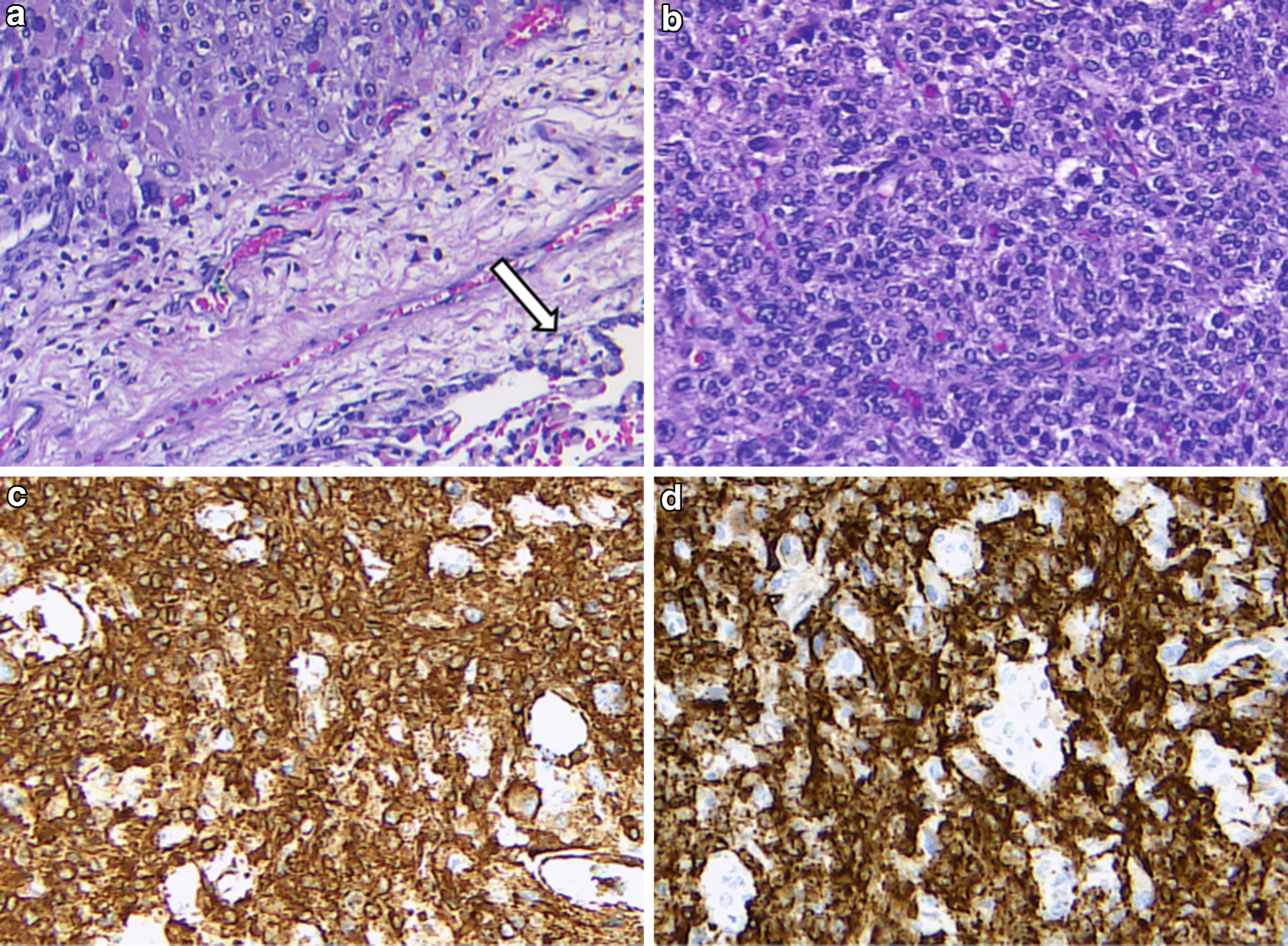 Histologic specimen of the pulmonary leiomyosarcoma, 100×. Haematoxylin–eosin: a,b Lung parenchyma (arrow) with sarcoma infiltration. Immunohistochemistry: c Smooth muscle actin, d Desmin