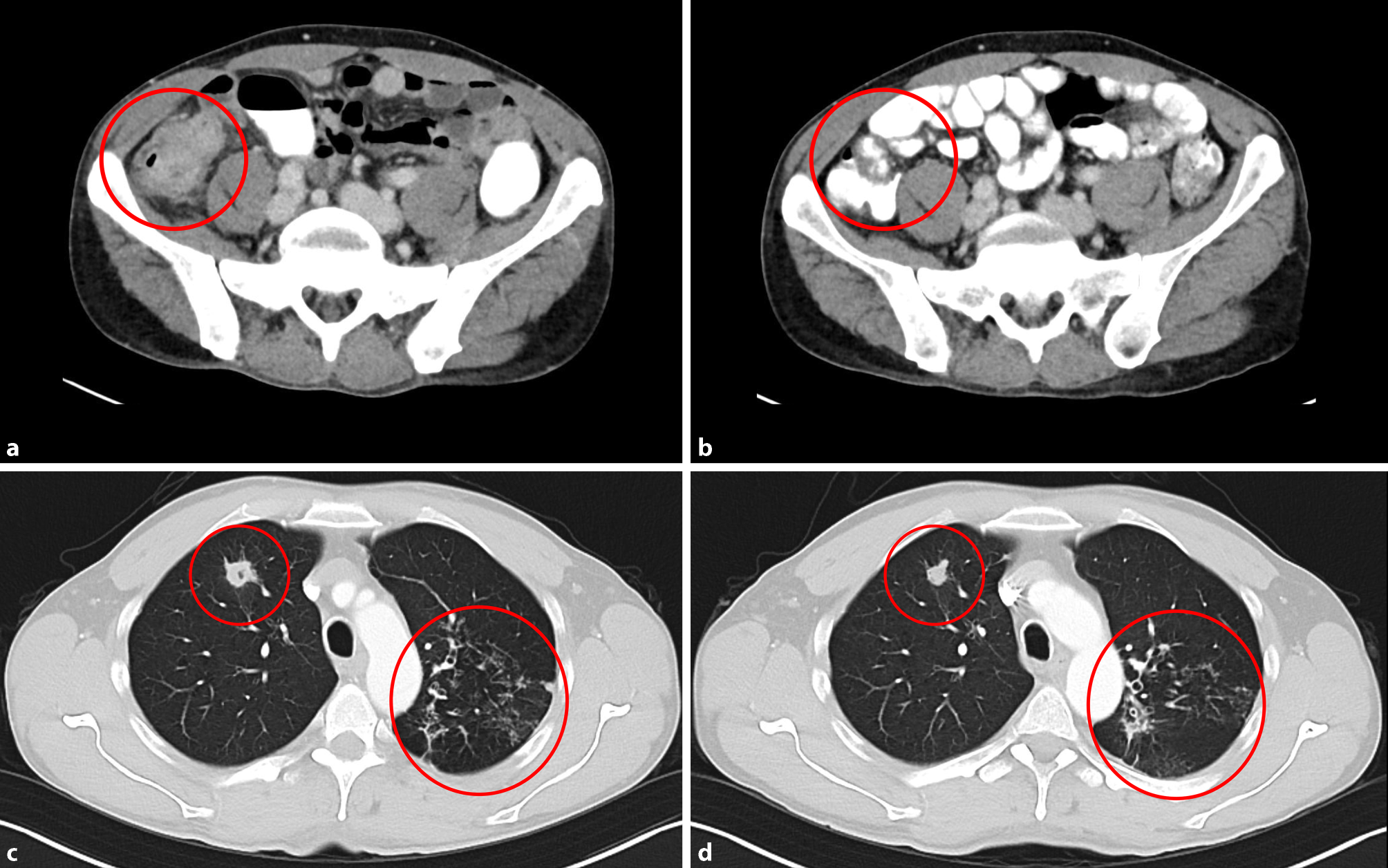 CT scan of the abdomen and the chest showing a gastrointestinal tumor mass in the cecum (red circle) and a pulmonary nodule in the left upper lung lobe as well as infiltrates in the right upper lung lobe (red circles) at time of diagnosis (a,c) and after 3 months of antimycobacterial treatment, respectively (b,d)