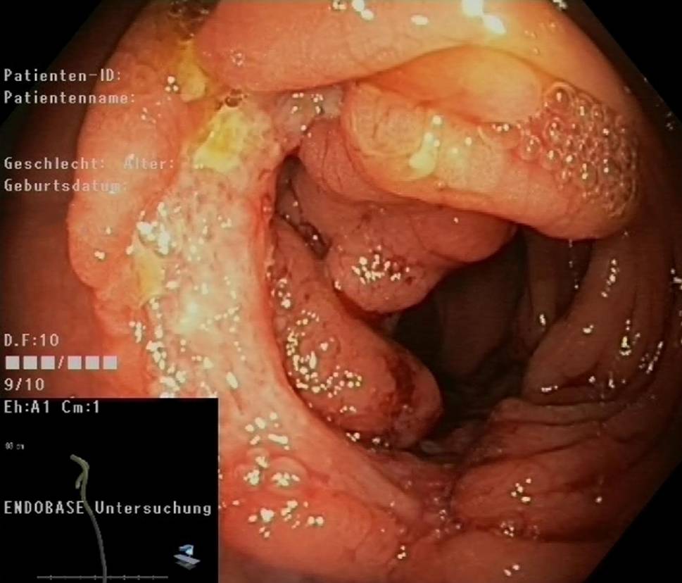 A 49-year-old previously healthy man from Upper Austria presented to the general practitioner with occasional epigastric pain aggravating after eating a meal. In physical examination a painless and soft abdominal mass was palpable in the right lower abdomen. Routine laboratory findings were unremarkable. An abdominal ultrasound showed a stenosis of the ascending colon.