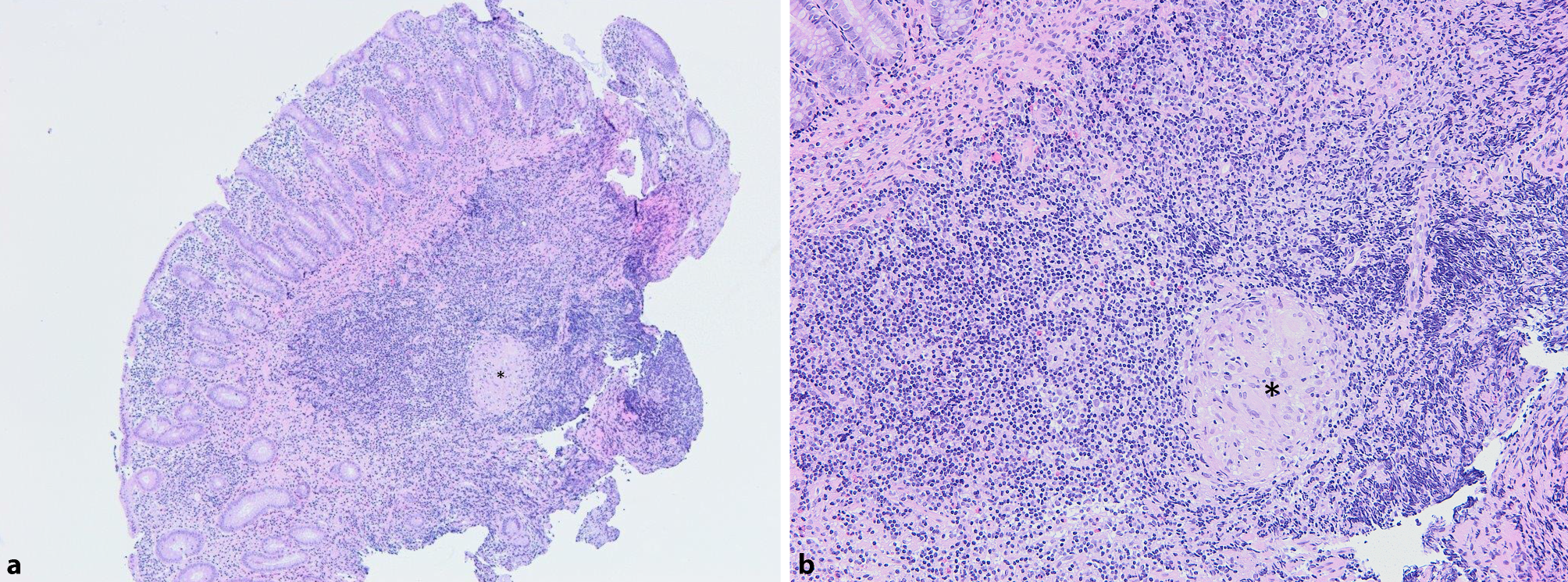 Histopathological specimen obtained from the tumor mass in the cecum showing intestinal mucosa with a highly active and chronic inflammation with epithelioid granuloma (star) and giant cells (hematoxylin and eosin; magnification: a ×4 and b ×20)