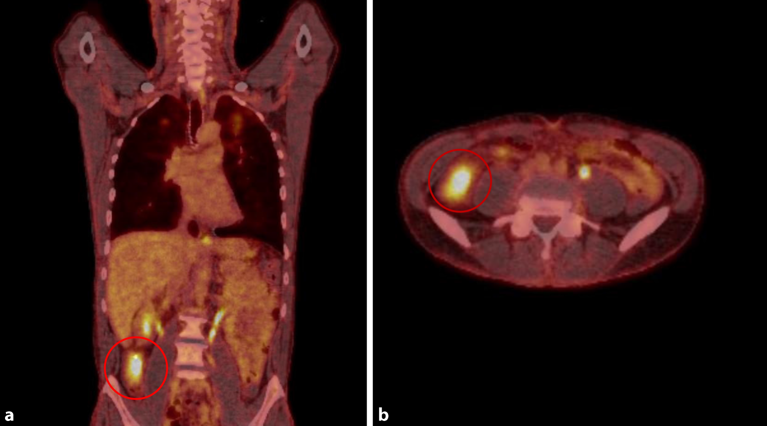 PET CT scan images of the coronal (a) and axial (b) planes showing high metabolic activity in the tumor mass of the cecum (red circles) with a maximum standardized uptake value (SUVmax) of 7.9. The high metabolic activity cranial of the tumor in coronal view and at the opposite side of the axial plane is a normal finding and represents parts of the kidney or urinary tract