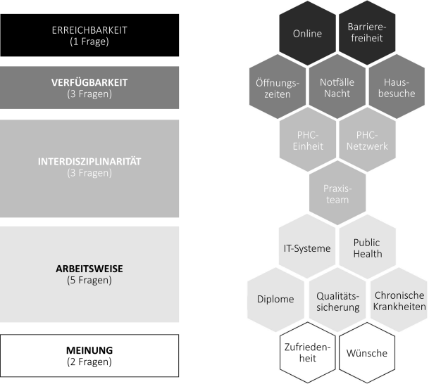 Im Vorfeld der Fragebogengestaltung wurde eine selektive Literaturrecherche durchgeführt und die erhobenen Informationen in den Prozess der Fragebogengestaltung integriert [10, 13‐16]. Neben Fragen zu soziodemografischen Merkmalen umfasste die Erhebung insgesamt 15 Fragegruppen zu den Aspekten Erreichbarkeit, Verfügbarkeit, Interdisziplinarität, Arbeitsweise und Zufriedenheit bzw. Zukunftswünsche. Nach einem Pre-Test (n = 17) wurden keine weiteren Änderungen am Fragebogen vorgenommen. Der Leitfaden zur Fragebogengestaltung ist in Abb. 2 dargestellt.