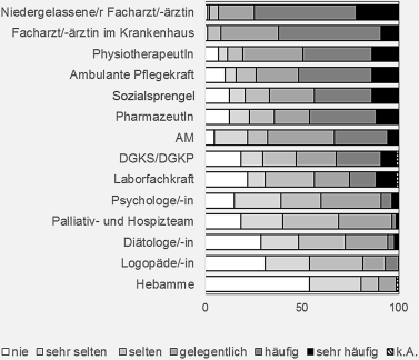 Während die ordinationsübergreifende Zusammenarbeit mit FÄ, PhysiotherapeutInnen, ambulanten Pflegekräften, Sozialsprengel, PharmazeutInnen, anderen AM und Laborkräften bereits relativ häufig stattfindet, ist vor allem die Kooperation mit Hebammen, LogopädInnnen, DiätologInnen, Palliativ- und Hospizteams sowie PsychologInnen unterrepräsentiert. Ein möglicher Grund dafür könnte eine geringe Relevanz der Zusammenarbeit im Alltag sein. Die Frage, ob zukünftig der Bedarf für multiprofessionelle Teams und Netzwerke mit den derzeit selten vertretenen Berufsgruppen bestehen könnte, wäre ein mögliches weiterführendes Forschungsfeld.