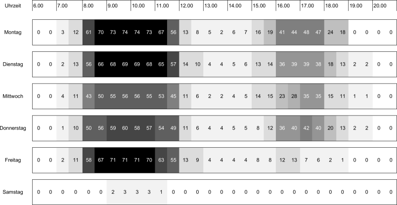 Im Durchschnitt haben die Ordinationen pro Woche ca. 23,5 h geöffnet, wobei sich ein deutlicher Fokus auf den Vormittagen zeigt. Die im Konzept der BZK [12] definierten Kernzeiten werden nur selten erfüllt. In Abb. 6 sind die Öffnungszeiten farblich dargestellt, wobei optisch die Tagesrandzeiten sowie die Mittagszeit als relativ schwach ausgeprägt imponieren. Im Wochenverlauf zeigen sich geringe Öffnungszeiten am Freitagnachmittag. An Samstagen gaben nur drei der befragten AM an, regulär geöffnet zu haben. Im Stadt-Land-Vergleich wurden in urbanen Regionen (M = 23,6) minimal höhere Stundenzahlen pro Woche angegeben als in ländlichen (M = 23,3). Demgegenüber wurden auf dem Land (M = 5,2) durchschnittlich mehr Hausbesuchsstunden pro Woche genannt als in der Stadt (M = 4,0). Verfügbarkeit via Mobiltelefon bei Notfällen und in der Nacht bestand bei 52 % (n = 45). Ein hausärztlicher Nachtdienst im Sprengel wurde von 48 % (n = 42) der AM genannt, wobei dies signifikant häufiger bei ländlichen Ordinationen (71 %, n = 36) zutraf als bei städtischen (9 %, n = 3).