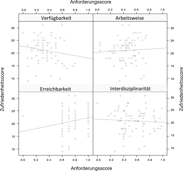 Für die Implementierung des Anforderungsscores wurden 83 der 87 Befragten eingeschlossen. Der maximal erreichbare Wert wurde lediglich für den Indikator Erreichbarkeit erzielt. Aus Tab. 1 kann abgelesen werden, dass für diese Variable auch der Mittelwert am höchsten ausgefallen ist (M = 0,745). Den zweithöchsten Mittelwert (M = 0,550) konnten die AM im Bereich Interdisziplinarität erreichen. Geringere Werte wurden in den Bereichen Verfügbarkeit (M = 0,405) und Arbeitsweise (M = 0,325) verzeichnet. Zur Überprüfung eines möglichen Zusammenhanges zwischen Zufriedenheitsscore und Anforderungsscore wurde eine Korrelationsanalyse durchgeführt. Abb. 8 zeigt die grafische Darstellung der Ergebnisse. Die statistische Auswertung ergibt keine signifikanten Ergebnisse.