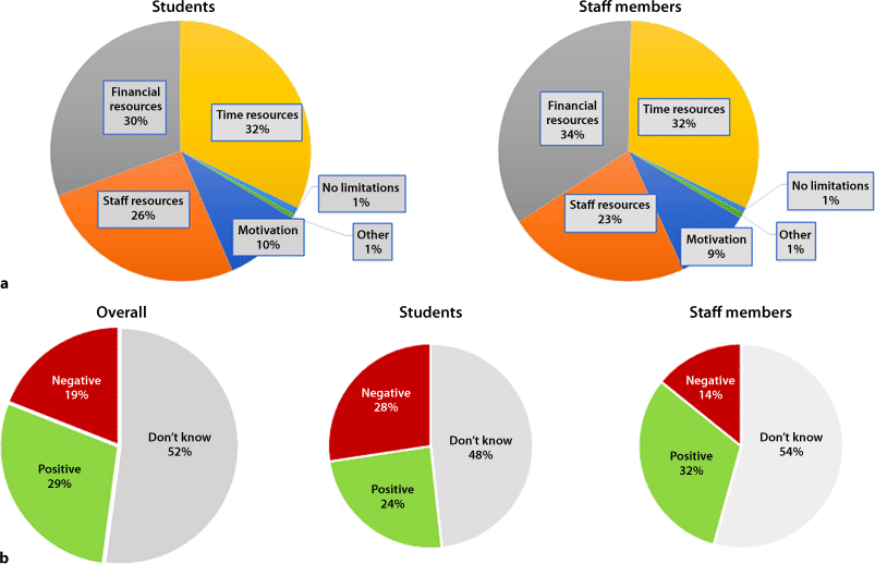 Students (32%) considered limited available time, while staff (34%) considered limited financial resources as the greatest challenge for in-hospital education. Limited personnel, financial and time resources accounted for 80% in both groups. Less than 1% of either students or staff members believed there are no limitations for on-job training in Austrian hospitals (Fig. 1a).