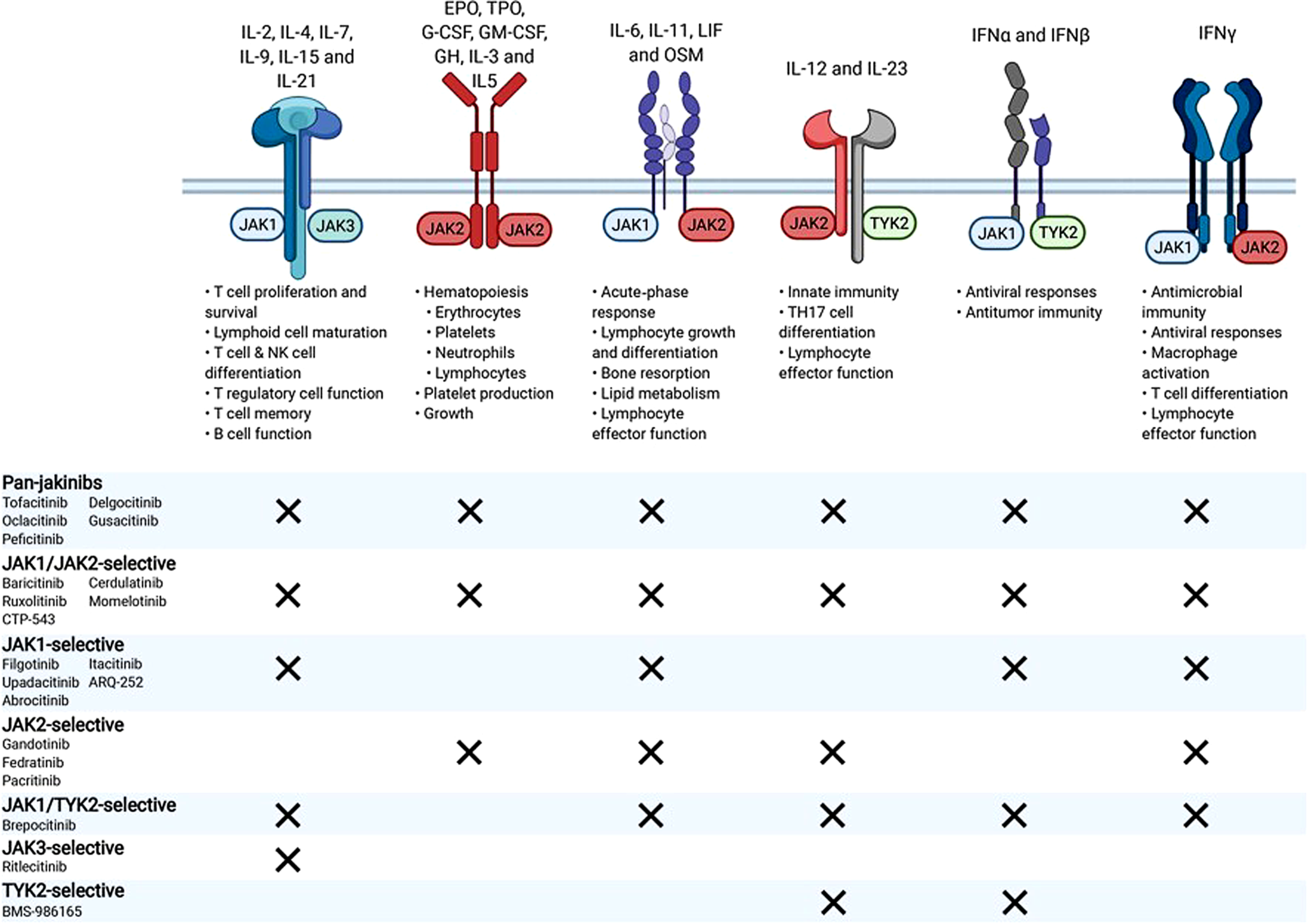 Les cytokines dites de type I (ex : IL‑2, IL‑4, IL‑7, IL‑9, IL-15, IL-21, IL‑6, IL-11, IL-12, IL-23, IL‑3, IL‑5, GM-CSF, G‑CSF, EPO) et de type II (ex : IL-10, IL-20, IL-22, IL-28, interférons) ont toutes des récepteurs transmembranaires multimériques, dont les domaines intra-cellulaires sont associés à des « Janus-kinases ». Les Janus-kinases (JAK) sont des tyrosine-kinases, c’est-à-dire qu’elles ajoutent un groupement phosphate sur les résidus tyrosine de leur protéines cibles. Les JAK tirent leur nom de la divinité romaine Janus, dont les deux visages symétriques sur une même tête évoquent les deux domaines presque identiques dans les JAK. Un des domaines est la kinase à proprement parler, l’autre n’a qu’une activité régulatrice du premier. Par ailleurs, les JAK fonctionnent par paires, homologues ou non.