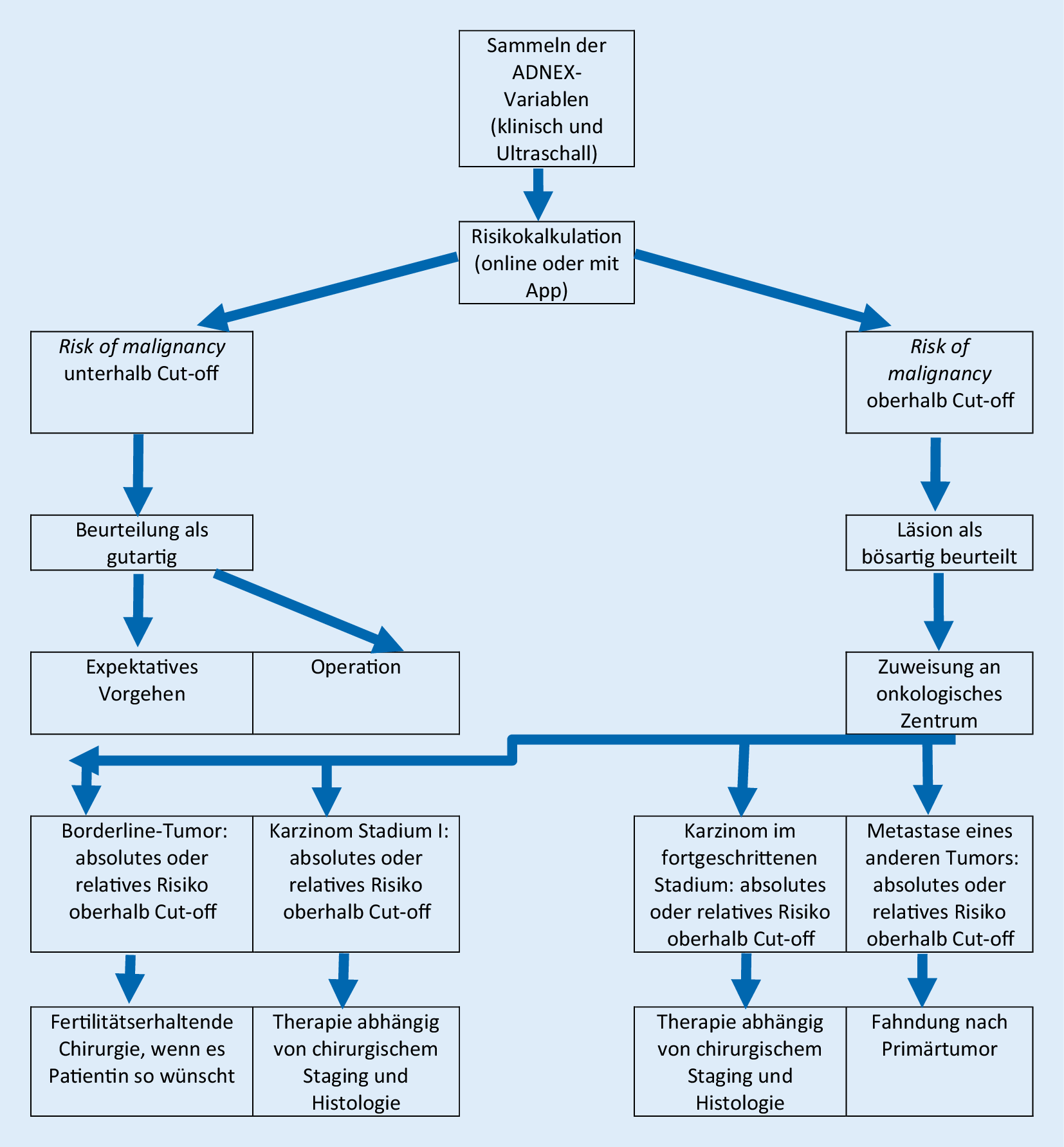 Eine Zyste an einem der Eierstöcke, die bei einer Ultraschalluntersuchung festgestellt wurde, führt vielfach zu einem operativen Eingriff, vor allem bei der postmenopausalen Patientin. Das rasche Wachstum und das hohe Malignitätspotenzial von Ovarialtumoren scheinen ein zügiges Handeln nahezulegen, an dessen Ende meist die allgemeine Erleichterung steht, dass die Zyste doch nicht bösartig war. Die in der Rückschau oft nicht wirklich notwendigen Operationen zahlreicher „Ultraschallzysten“ führte zu einer Geringschätzung der Methode der gynäkologischen Vaginalsonographie. Mit Einführung der IOTA-Kriterien erlebt der gynäkologische Ultraschall eine Qualitätsverbesserung, ähnlich wie 20 Jahre zuvor die Einführung der Nackenfaltenmessung dem Pränatalultraschall zu allgemeiner Akzeptanz verhalf. Mit dem ADNEX-Modell, einem an Tausenden Patientinnenverläufen validierten Mehrklassenrisikomodell, ist es nun möglich, unmittelbar im Anschluss an die Ultraschalluntersuchung mit der Patientin ihr individuelles Risiko zu besprechen.