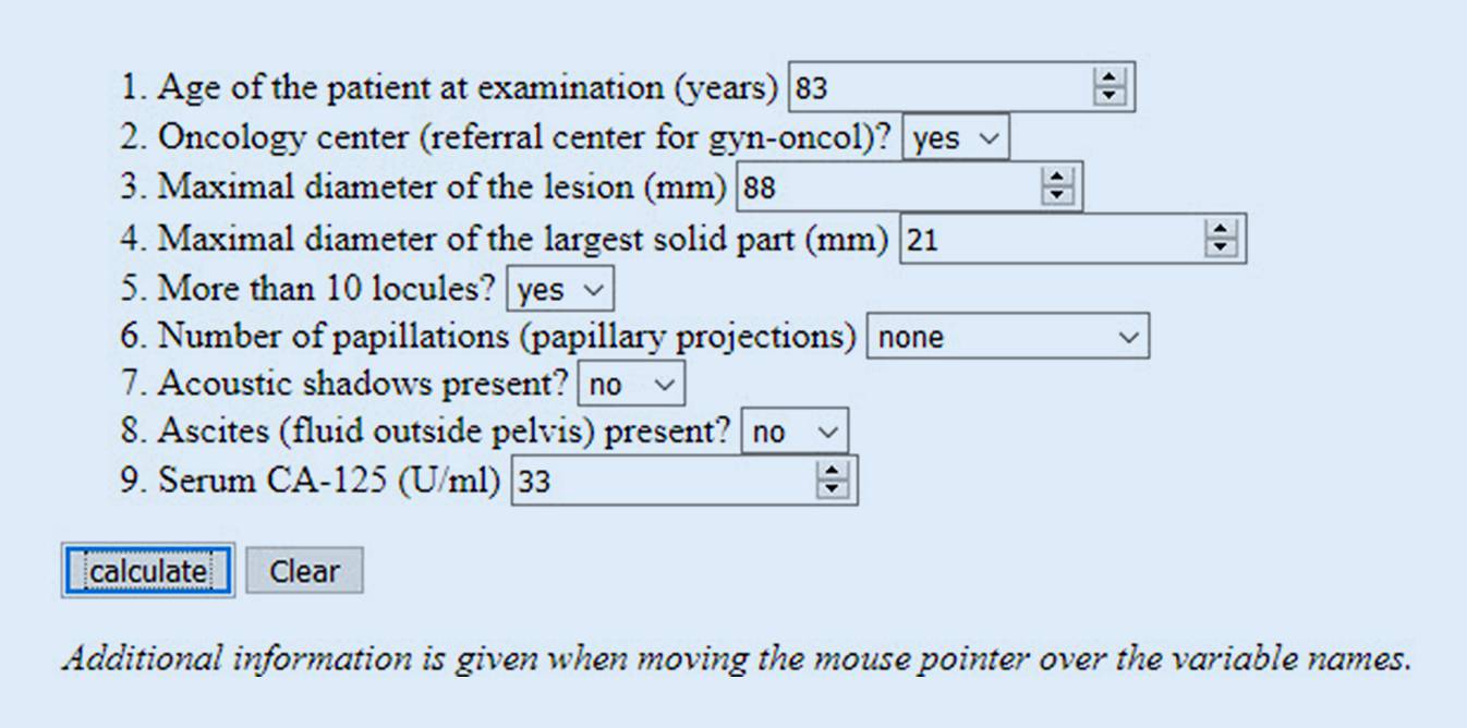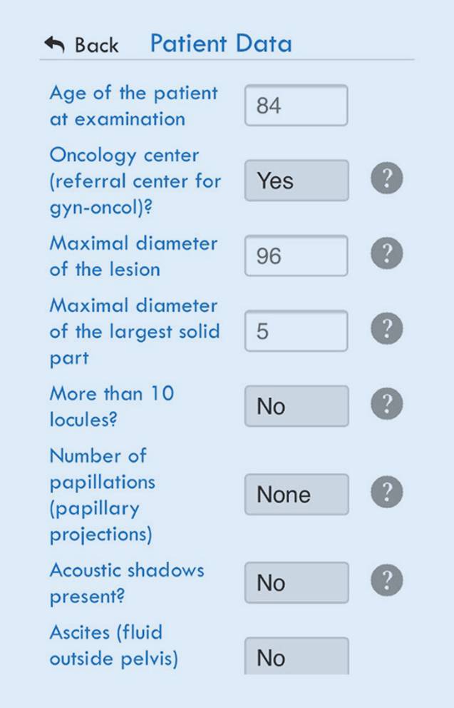 Sechs Prädiktoren des ADNEX-Modells basieren auf Ultraschall, auf Beurteilungen und Messungen. Im Rahmen der Ultraschalluntersuchung müssen die Kriterien und Messgrößen, aus denen diese Prädiktoren entstehen, schrittweise „abgearbeitet“ und am Ende der Untersuchung in das Modell eingegeben werden (Abb. 1 und 2). Die Art der Messung ist durch die bekannten „simple rules“ von IOTA vorgegeben [4].