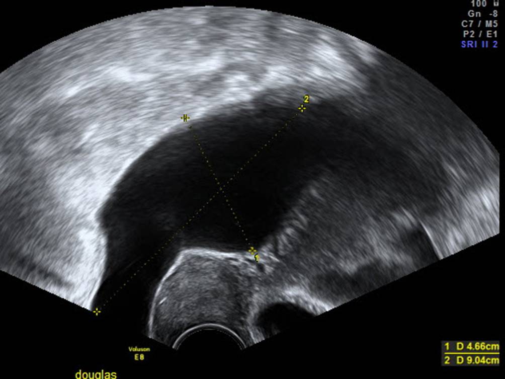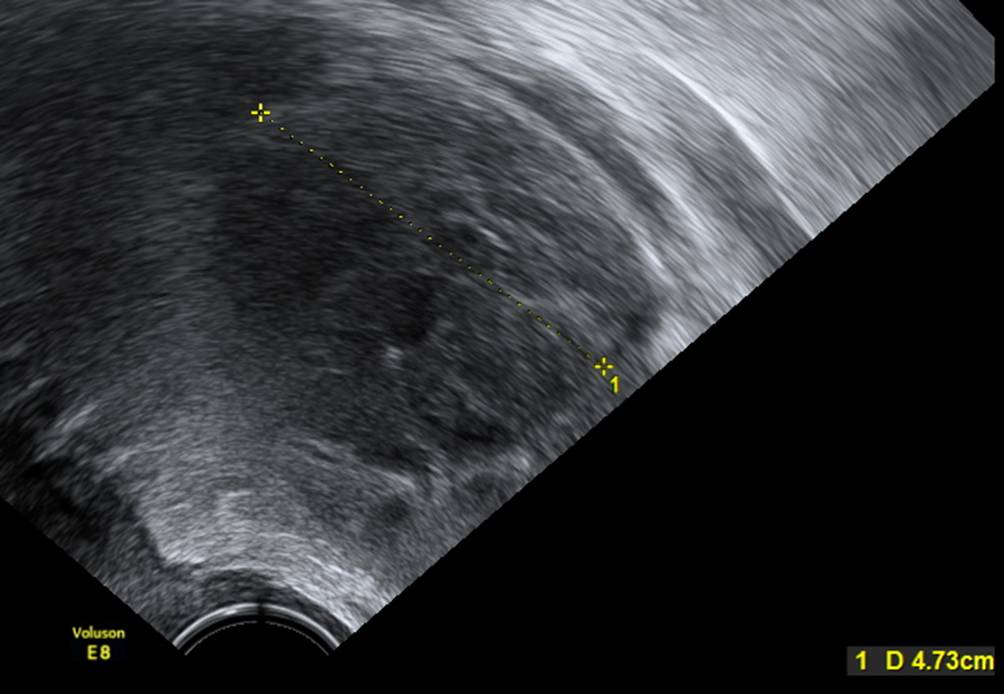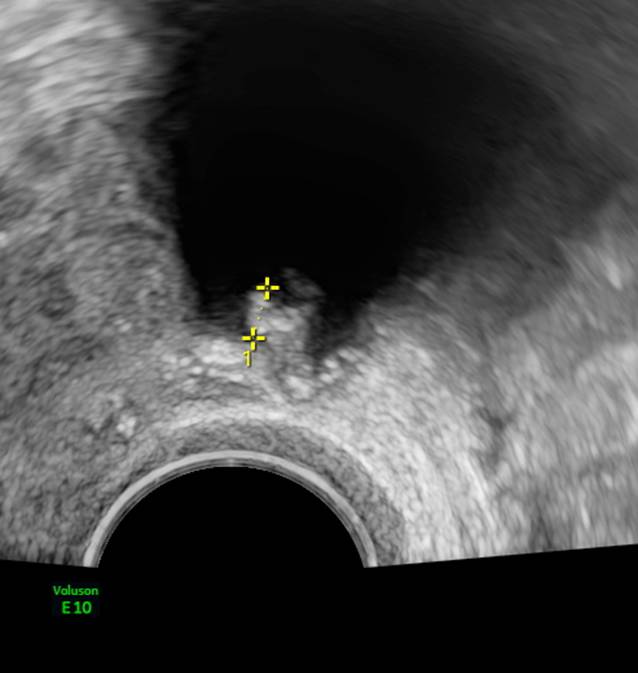 Beispiel für papilläre Projektion. Die gemessene Strecke beträgt 4,4 mm. Es ist wichtig, nur die papilläre Projektion zu messen und nicht auch den Zystenrand