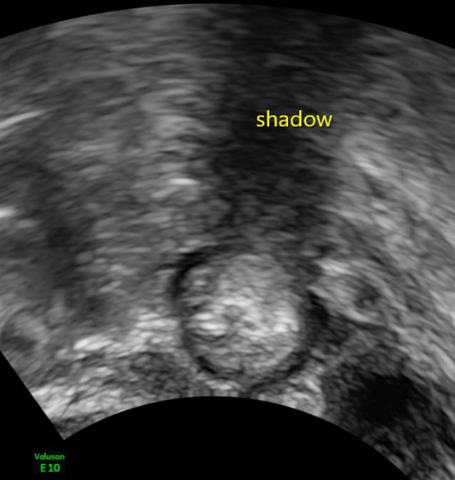 Beispiel für „shadowing“ distal eines 18 mm großen Dermoids. Diese Verschattungen ergeben in ADNEX „mildernde Umstände“ und senken das kalkulierte Risiko