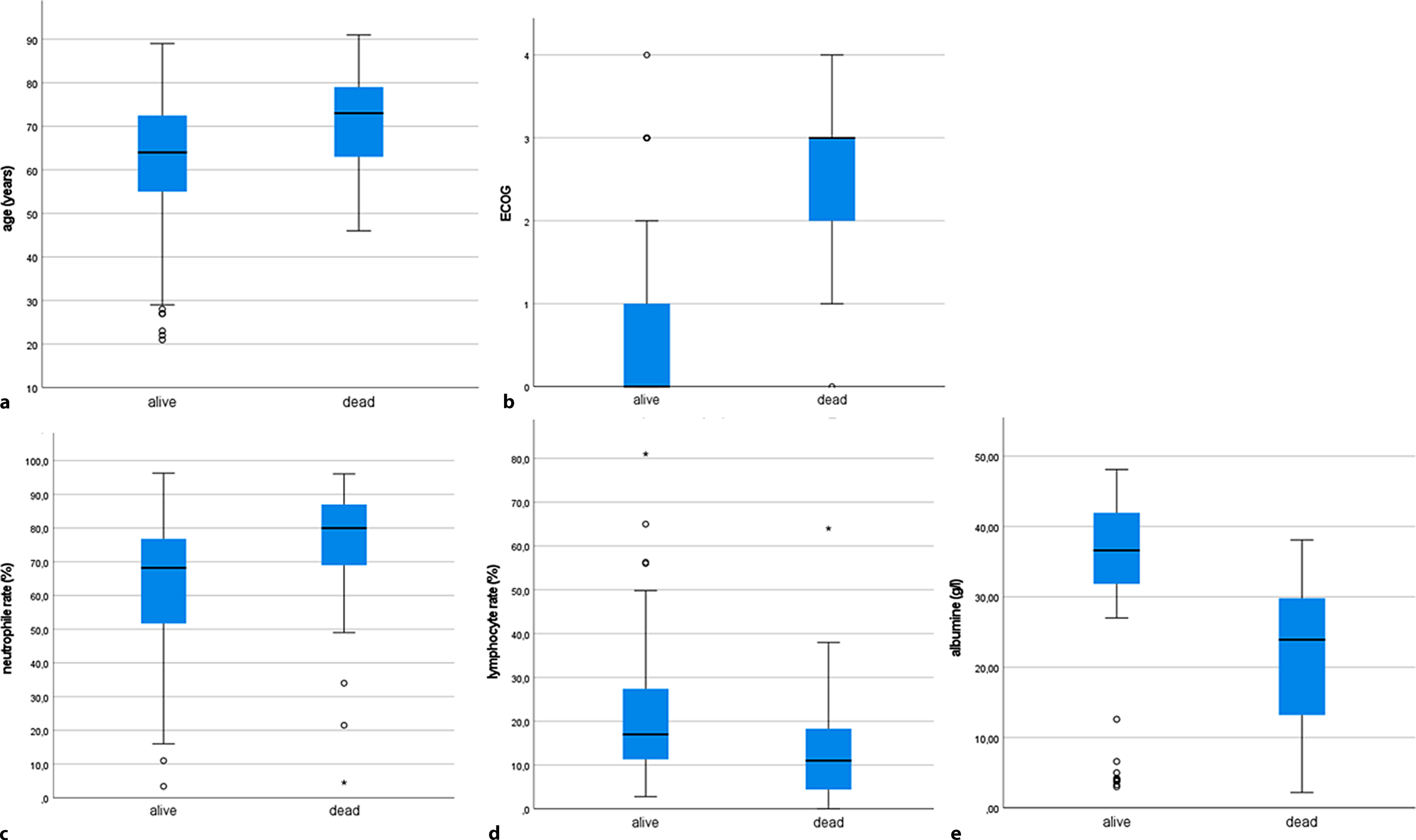 Factors associated with higher mortality in cancer patients. a age, b ECOG, c neutrophile percentage, d lymphocyte percentage, e albumin