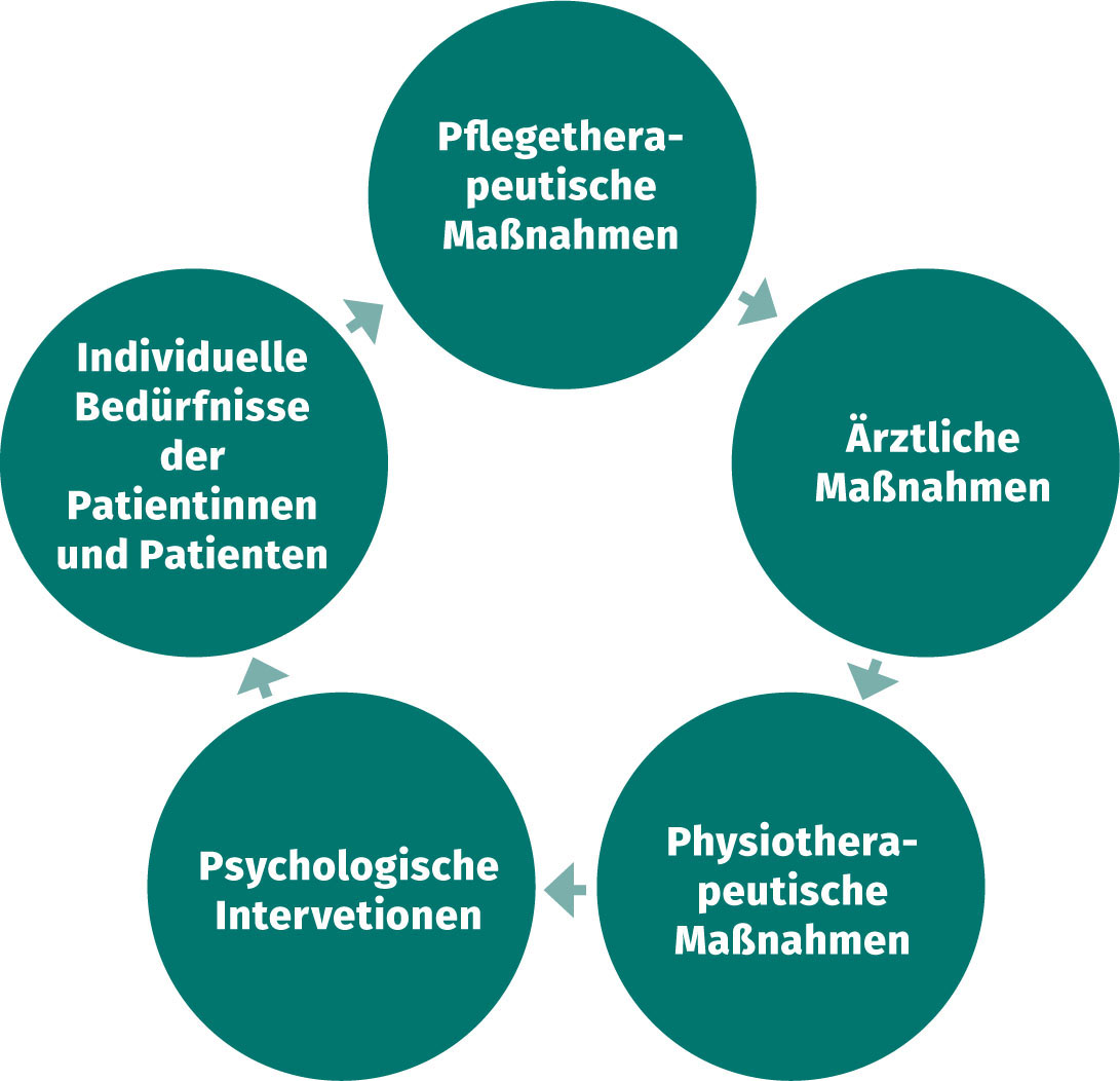Sprach man im GuKG 1997 noch von „Mitwirkung an der Rehabilitation“, wurde 2016 eine eigenständige Tätigkeit daraus, die DGKP trägt nunmehr auf Grundlage wissenschaftlicher Erkenntnisse durch präventive, kurative, rehabilitative und palliative Kompetenzen zur Unterstützung des Heilungsprozesses und der Bewältigung von gesundheitlicher Beeinträchtigung sowie zur Aufrechterhaltung der höchstmöglichen Lebensqualität aus pflegerischer Sicht bei (Weiss/Lust, 2020). Neu hinzugekommen ist die Aufrechterhaltung der Behandlungskontinuität, die gerade im Nebenwirkungsmanagement der multimodalen Schmerztherapie eine große Rolle spielt. Werden Nebenwirkungen von Beginn an präventiv vermieden oder zeitgerecht gelindert, werden Therapieabbrüche durch die Patientinnen und Patienten verringert.