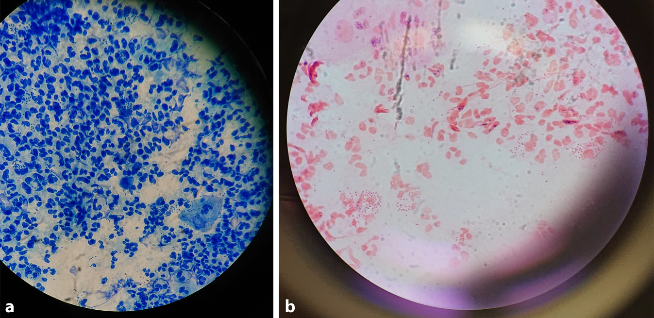 a Methylenblaufärbung und b Gram-Färbung eines urethralen Ausstrichs. In der 100-fach-Vergrößerung („high-power field“) finden sich massenhaft neutrophile Granulozyten, definierend für eine Urethritis. Zudem finden sich Diplokokken, die sich stellenweise auf das Zytoplasma der neutrophilen Granulozyten projizieren, passend zu Gonokokken. Im rechtenunteren Bildausschnitt bei a sowie im linkenoberen bei b sind zudem Epithelzellen zu erkennen
