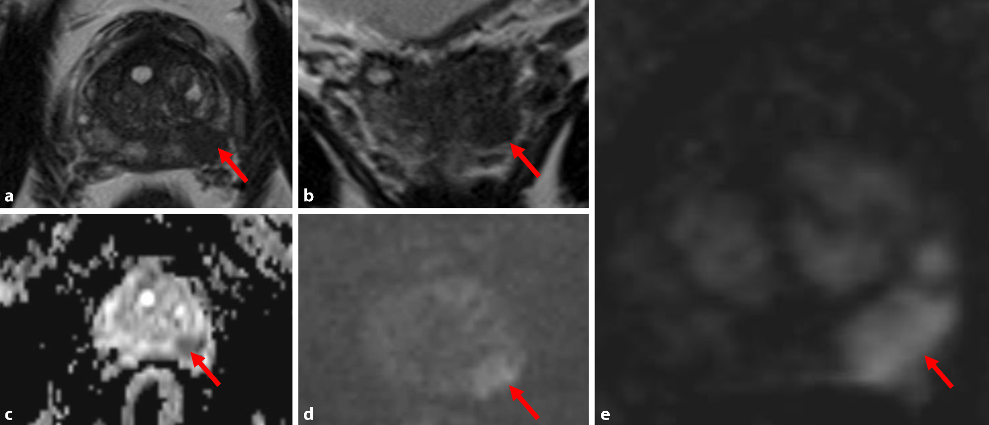 Prostate carcinoma in the peripheral zone (red arrow): hypointensity on axial T2-weighted (a) and on follow-up T2-weighted images (b); hypointensity on ADC (Apparent Diffusion Coefficient) maps (c) and hyperintensity on diffusion-weighted images (d); marked early contrast enhancement on dynamic contrast-enhanced sequences (e)