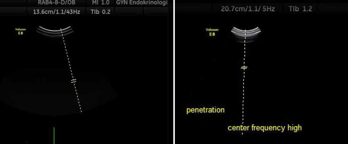 Doppler im Ersttrimester-Preset dieses Geräts hat einen Ti von 0,2; schaltet man im selben Gerät auf den Penetration-Preset und „center frequency high“, springt der Ti auf 1,2. Während man mit einem Ti von 0,2 eine Stunde schallen kann, halbiert sich bei Ti 1,2 die erlaubte Zeit der Beschallung