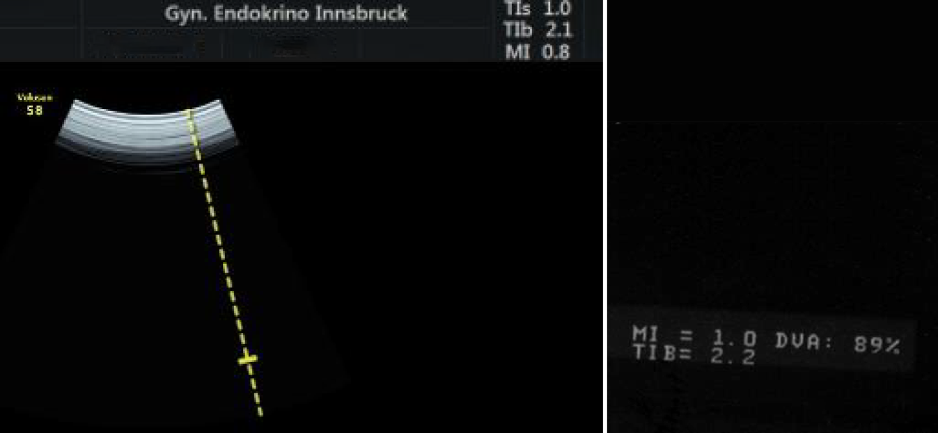 Wir sind es von allen Ultraschallmonitoren gewohnt, dass um die eigentliche Bildfläche, auf der das von uns generierte Bild erscheint, eine Reihe von Zahlen und Texten drapiert sind, die dem Ganzen einen technisch-komplizierten Eindruck verleihen. Neben dem Namen der Patientin und dem Datum (die beide stimmen sollten) ist von all diesen Buchstaben- und Zahlenkombinationen nur eine wichtig: der Ti, das ist der „thermal index“. Dieser sagt aus, um wie viel sich das Gewebe im Wirkungsbereich des Ultraschalls erwärmen kann. Der zweite Index, der „mechanical index“ (Mi) ist für den gynäkologisch-geburtshilflichen Schall bedeutungslos.