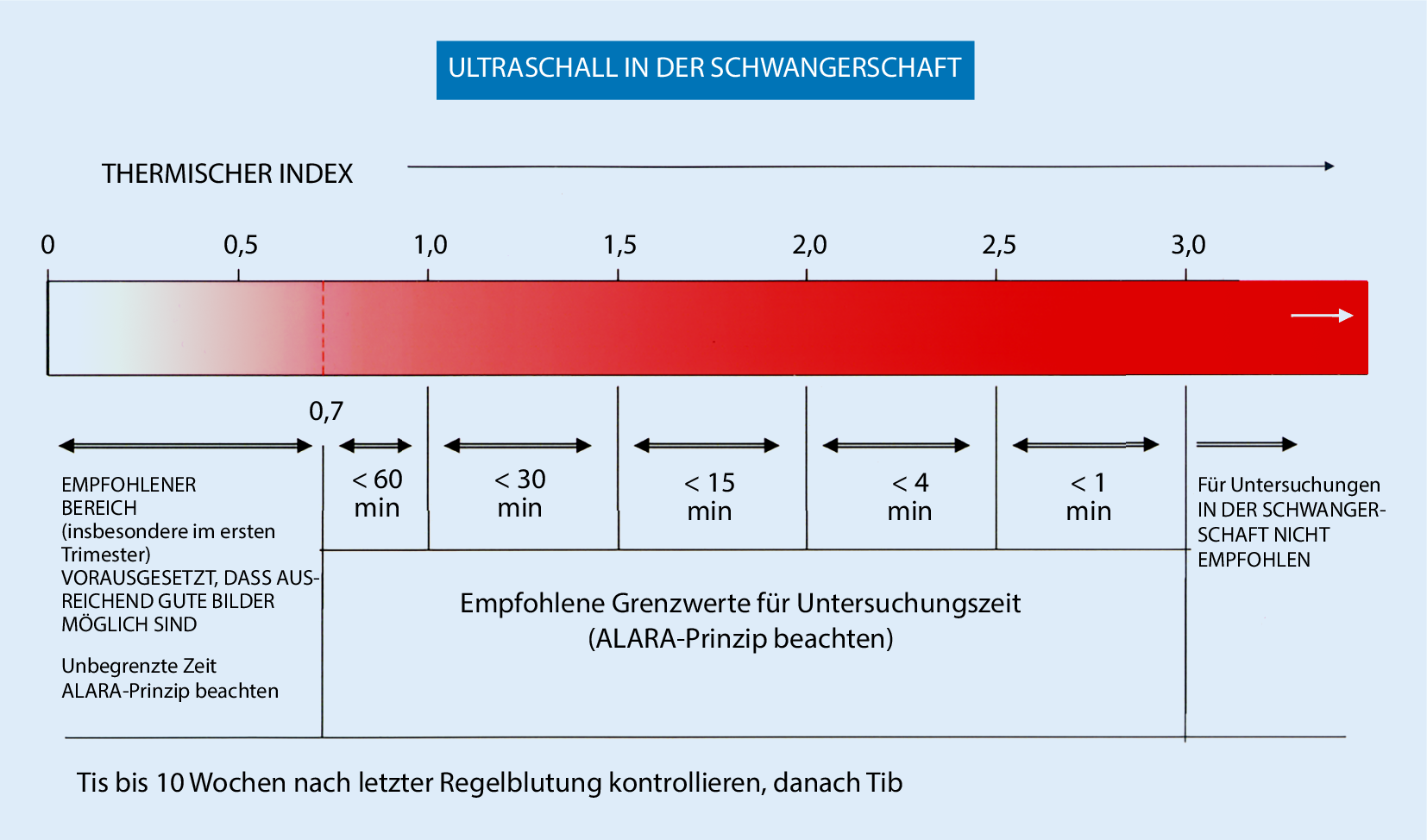 An allen Ultraschallgeräten in Großbritannien muss ein A4-Karton angebracht werden, auf dem die erlaubte Ultraschallzeit in der Schwangerschaft in Relation zum „thermal index“ aufgelistet ist. Im Idealfall sollte der Ti nicht über 0,7 gehen, ein Tis über 3,0 sollte in der Schwangerschaft nicht zum Einsatz kommen (BMUS). ALARA „As low as reasonably achievable“ (Minimierungsprinzip), Ti „thermal index“ (thermischer Index), Tib „thermal index bone“ (thermischer Index der Knochen), Tis „thermal index soft tissue“ (thermischer Index der Weichgewebe)