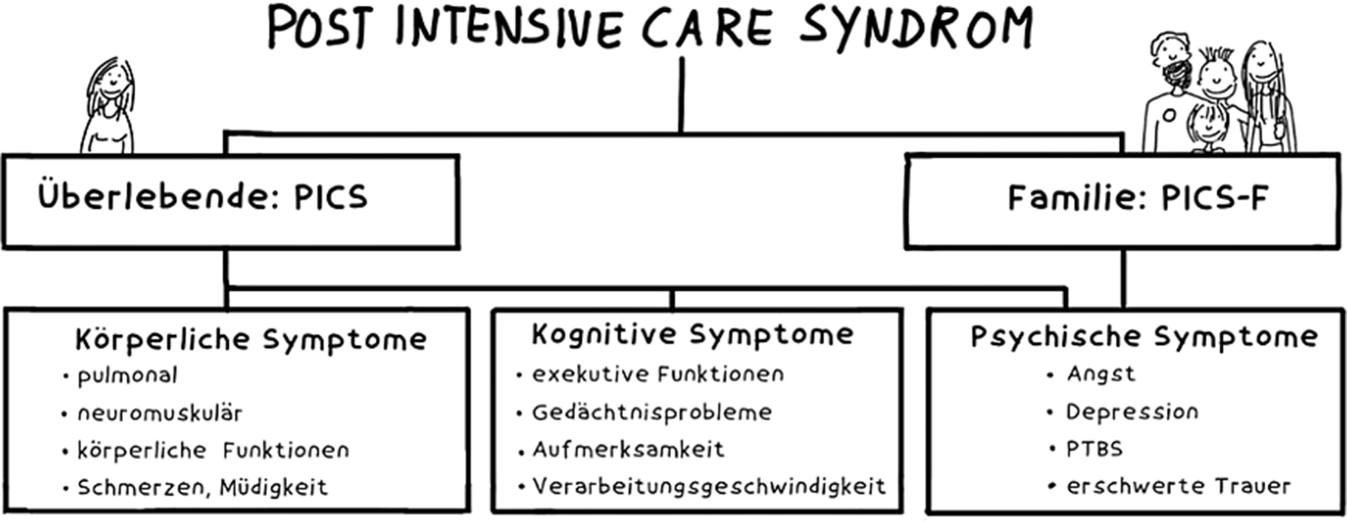 Internationale Daten zeigen, dass ca. 80 % der Überlebenden eines Intensivaufenthalts innerhalb des ersten Jahres nach der Entlassung aus dem Krankenhaus an PICS-Symptomen leiden [2]. Die Langzeitfolgen einer Intensivtherapie betreffen nicht nur die ehemaligen Patient:innen selbst: die psychische Belastung, die durch die Sorge um eine:n An‑/Zugehörige:n oder finanzielle Probleme entsteht, wirkt sich oft auch auf das nahe soziale Umfeld aus (PICS Family – Abb. 1; [1, 2]).