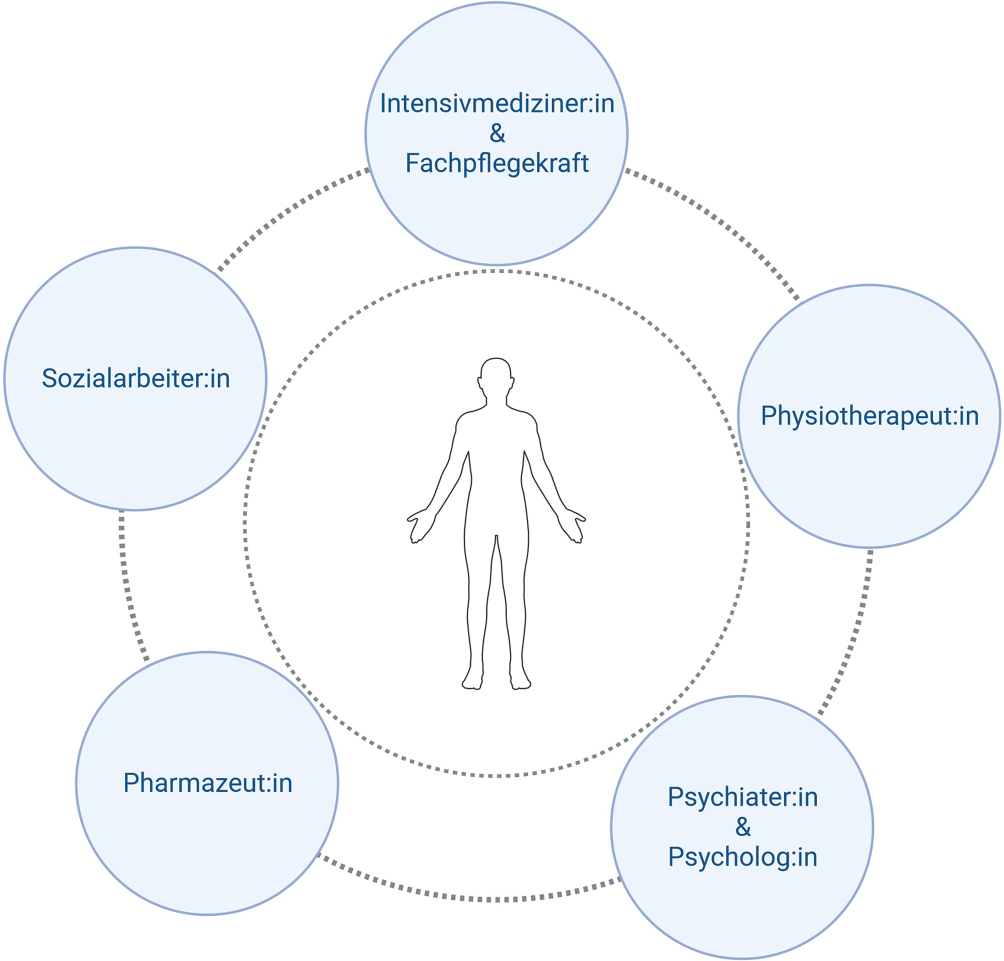 Entsprechend dem zuvor beschriebenen internationalen Standard werden ehemalige Intensivpatient:innen dort an drei definierten Zeitpunkten innerhalb eines Jahres nach Entlassung aus dem Krankenhaus von einem multiprofessionellen Team (Abb. 2) auf das Bestehen von PICS-Symptomen untersucht. Durch die Verknüpfung des klinischen Outcomes mit hochauflösenden Daten, die während des Intensivaufenthalts gesammelt werden, sowie mit den Ergebnissen epigenetischer Untersuchungen wird das Studienteam einen Beitrag zur Entwicklung künftiger PICS-Vorhersagemodelle leisten.
