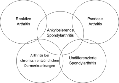 Unter dem Begriff seronegative Spondylarthritis oder Spondylarthropathien (SpA) werden unterschiedliche Krankheitsbilder zusammengefasst, die durch ähnliche klinische Erscheinungen charakterisiert sind. Dazu zählen eine entzündliche Affektion der Wirbelsäule und der Iliosakralgelenke (ISG), die namensgebend für diese Gruppe an Krankheiten ist, eine periphere Arthritis, vorwiegend vom oligoartikulären, asymmetrischen Typ und extraartikuläre Manifestationen im Sinne einer Skleritis bzw. Episkleritis, Colitis, Psoriasis, Enthesitis. Typisch für diese Gruppe sind eine Assoziation mit HLA-B27 sowie das Fehlen eines Rheumafaktors. Zu den SpA gehören die ankylosierende Spondylitis (AS; Mb. Bechterew), die mit der Psoriasis assoziierte Psoriasisarthritis (PsA), die reaktive Arthritis (ReA), die Arthropathie bei chronisch entzündlichen Darmerkrankungen (CEDA) und die undifferenzierte Spondylarthritis (uSpA) (Abb. 1).