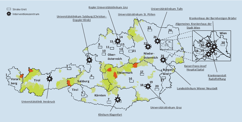 In Österreich gewährleistet ein flächendeckendes Netzwerk aus 38 Stroke Units den hohen Standard in der Schlaganfallversorgung. In 11 Schlaganfallzentren werden regelmäßig neurointerventionelle Eingriffe wie die mechanische Thrombektomie durchgeführt (Abb. 1).