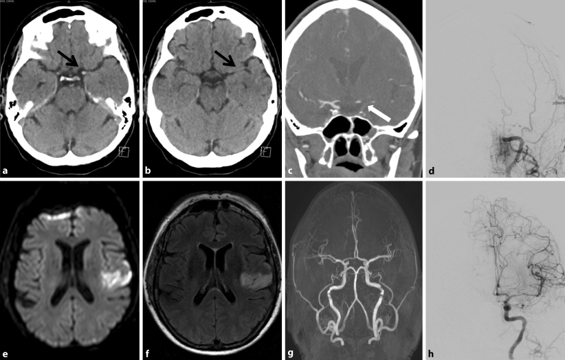 Kranielle Computertomographie nativ: Dichtes Mediazeichen links (schwarzer Pfeil) ohne Frühinfarktzeichen im Mediastromgebiet (a und b). Computerangiographie mit Kontrastmittel: Karotis-T-Verschluss links (weißer Pfeil) (c). Katheterangiographie: Verschluss der distalen A. carotis interna (d), mechanische Rekanalisation mit vollständiger Rekanalisierung TICI 3 (h). Kranielle Kernspintomographie postinterventionell: ischämischer mittlerer Mediateilinfarkt links (in Diffusion e und in FLAIR f). Intrakranielle Kernspinangiographie 3d-TOF: Rekanalisierung der A. carotis interna links mit unauffälligen Flusssignalen in den Arteriae cerebri mediae und anteriores ohne Stenose (g)