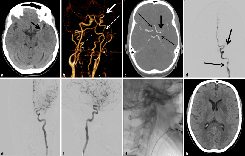 Kranielle Computertomographie nativ: Dichtes Mediazeichen links (Pfeil) ohne Frühinfarktzeichen im Mediastromgebiet (a). Computerangiographie mit Kontrastmittel: A.-cerebri-media-Verschluss links (Pfeil), Kaliberschwankungen der A. carotis interna links (Pfeil gestrichelt) (b), unzureichende Kollateralisierung über A. communicans anterior und posterior links bei Hypoplasie (Pfeil gepunktet) (c). Katheterangiographie: Verschluss M1-Segment der A. cerebri media links (Pfeil) und Dissektion der A. carotis interna links (Pfeil gepunktet) (d). Nach mechanischer Rekanalisation komplette Wiedereröffnung der A. cerebri media links (TICI 3) (e und f) sowie Stentimplantation der A. carotis interna links (g). Postinterventionelle Computertomographie nativ: ischämischer Stammganglieninfarkt links (h)