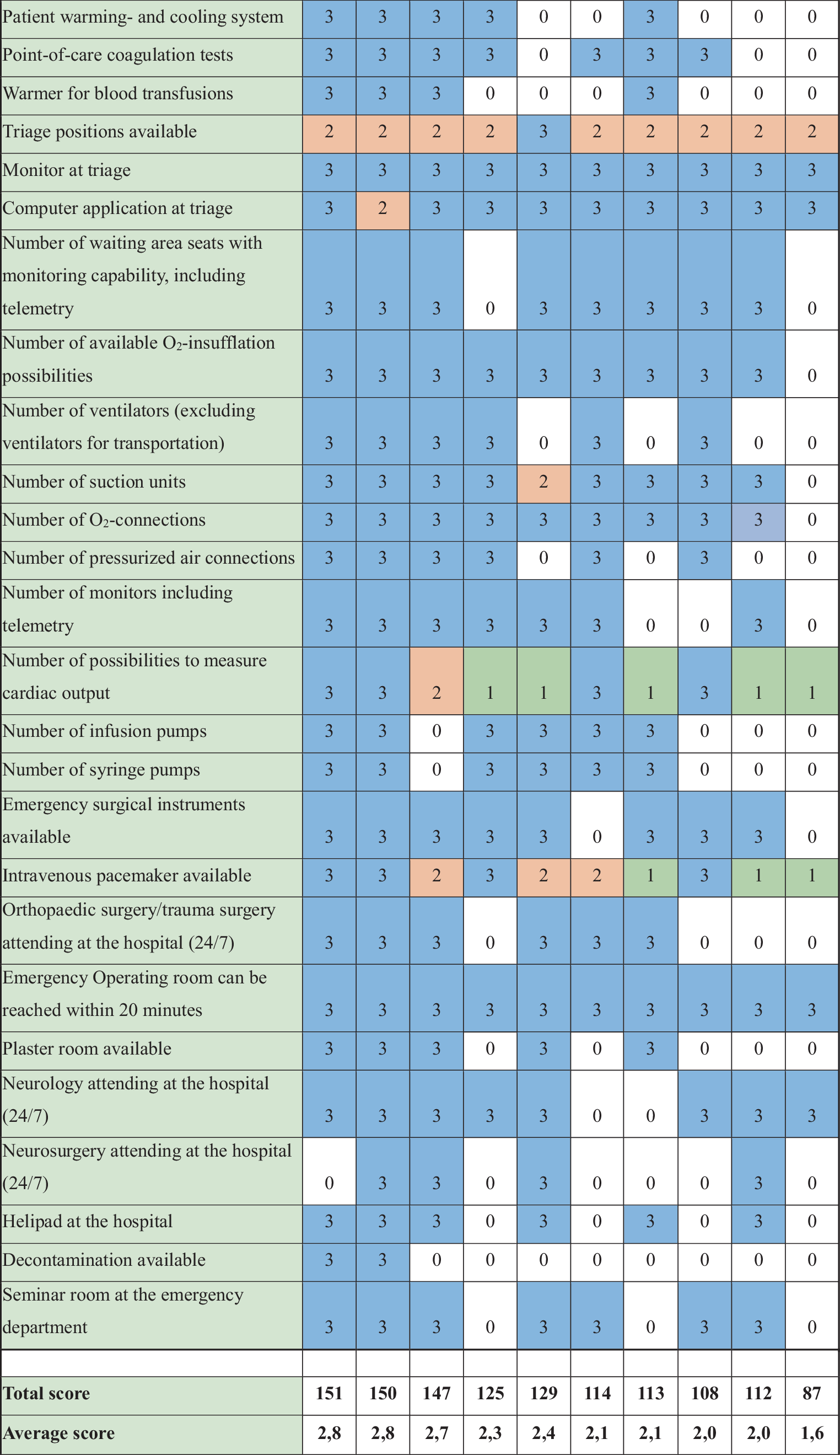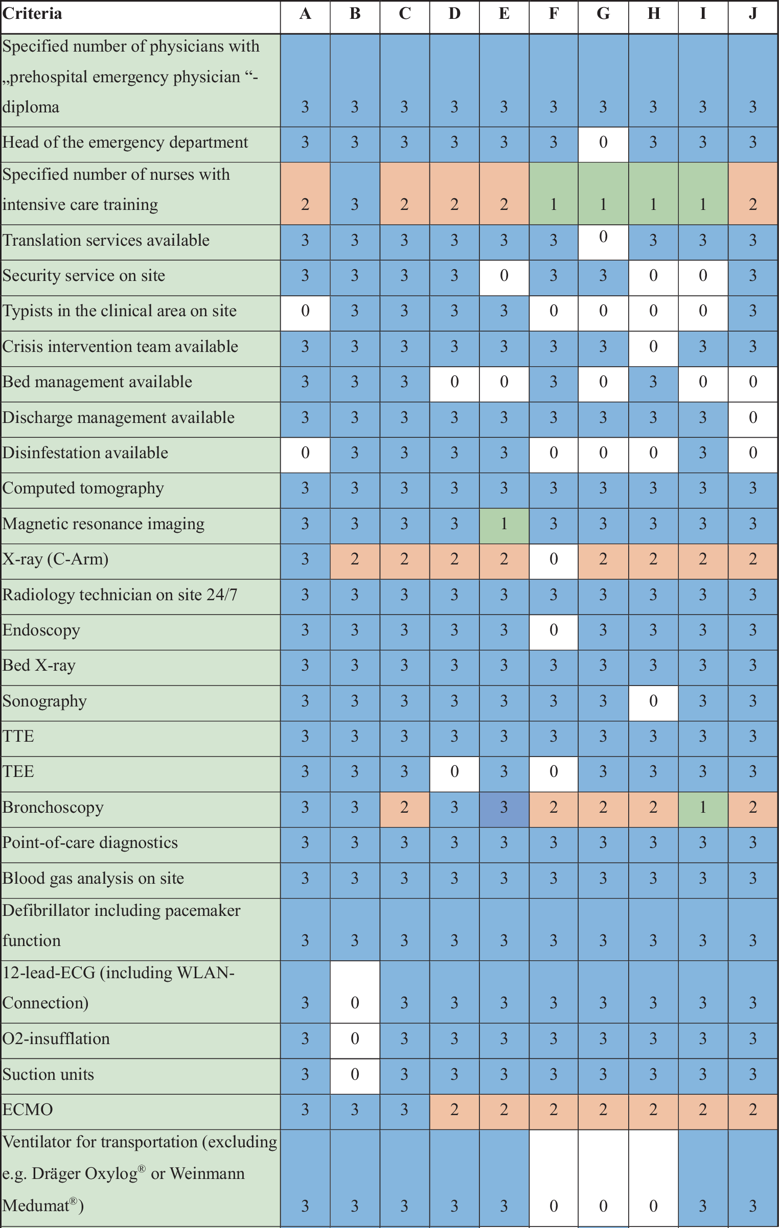 List of 54 proposed structural quality criteria for emergency departments in Austria. TEE transoesophageal echocardiography; TTE transthoracic echocardiography. 0 (white) = criteria not met; 1 (green) = basic care; 2 (orange) = standard care; 3 (blue) = comprehensive care. A–J: included hospitals. ECG electrocardiogram, ECMO extracorporal membrane oxygenator