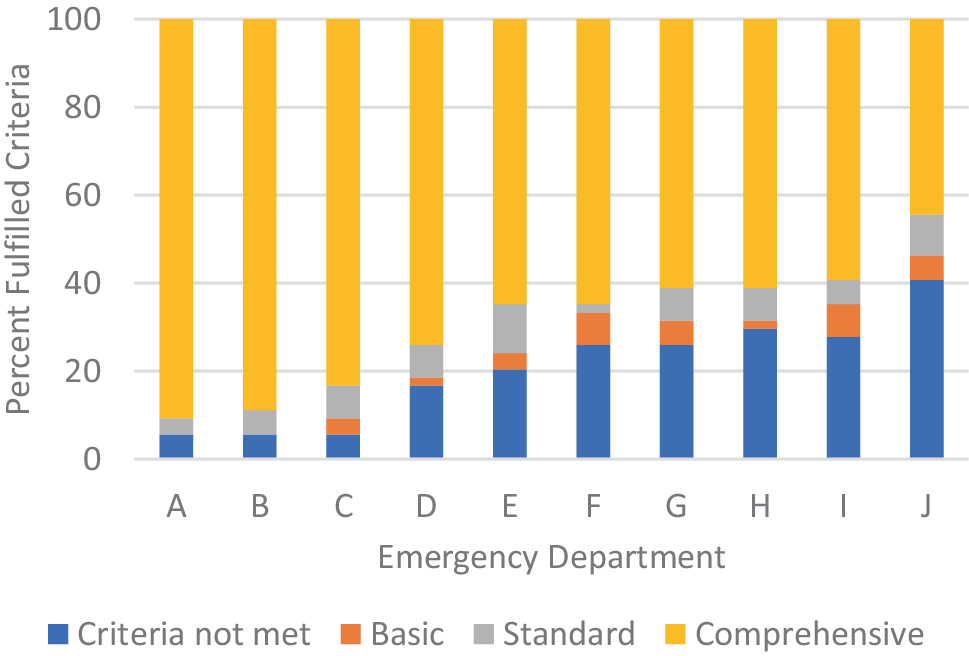 Among 16 hospitals, we identified 10 emergency departments. The scores ranged from 87 points (54%) to 151 points (95%). None of the departments met all structural quality criteria. Overall, across all emergency departments, 69% of the criteria aligned with comprehensive care, 7% with standard care and 3% with basic care, while 21% of the criteria were not met at all.
