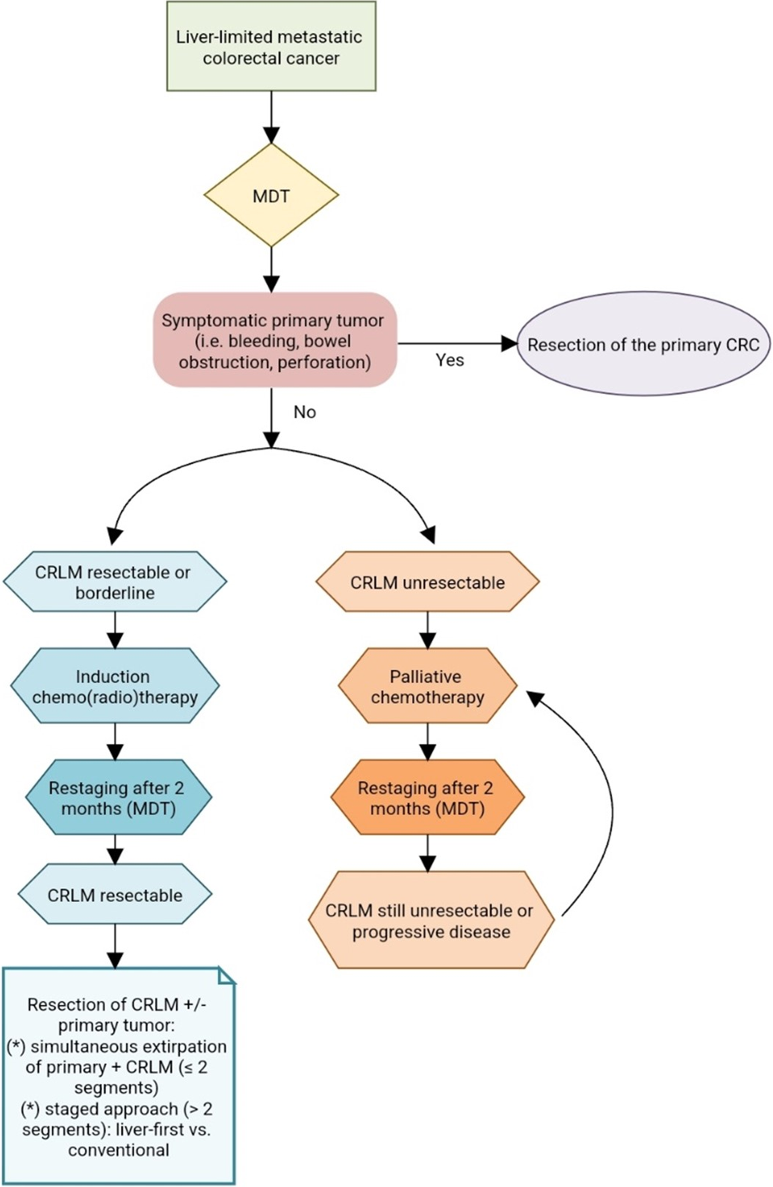 Exemplary treatment algorithm for synchronous colorectal liver metastases (CRLM). MDT multidisciplinary tumor board, CRC colorectal cancer