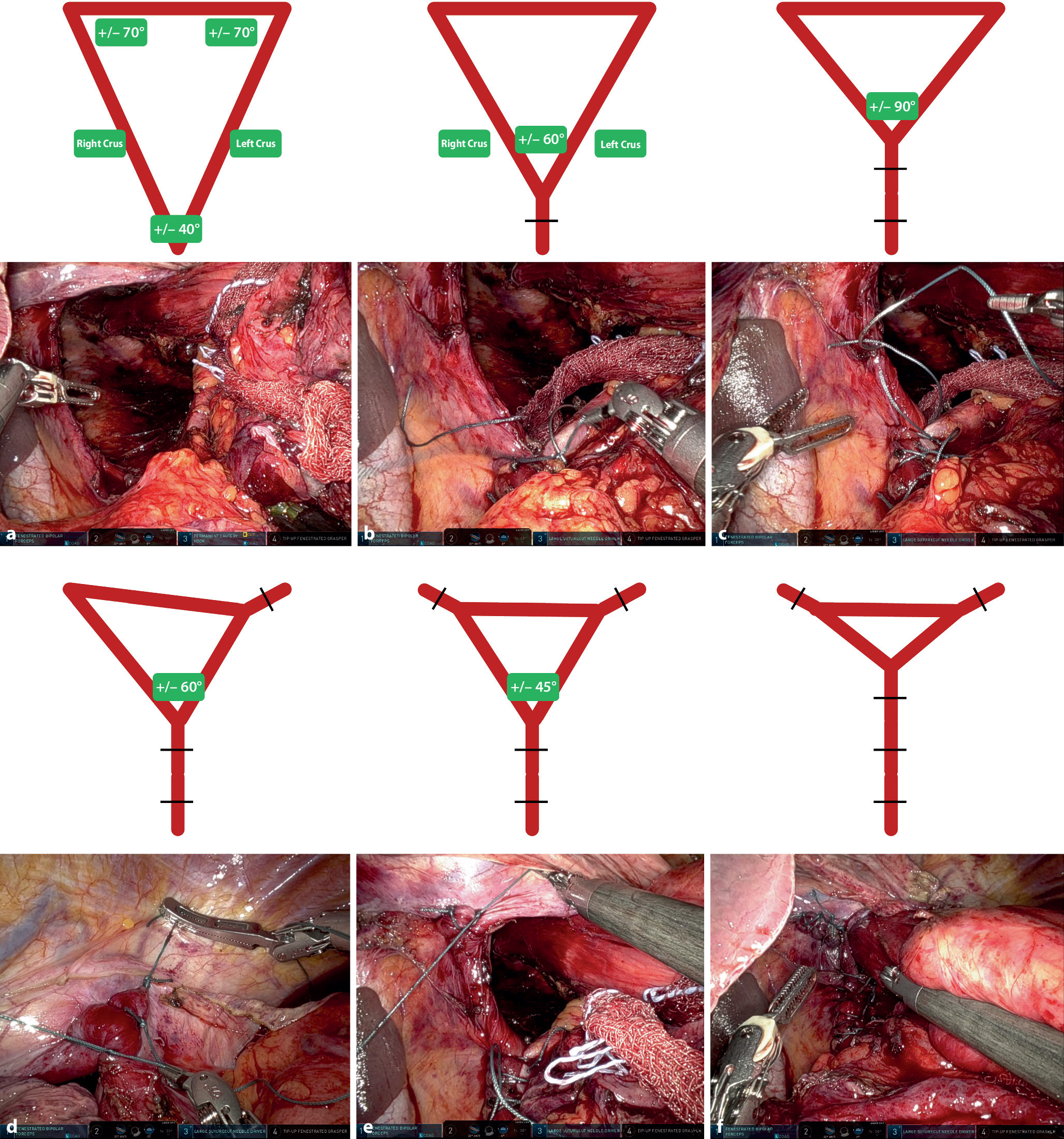 Hiatal closure demonstrating “low tension triangulation.” Subfigures a–e illustrate a stepwise technique, starting posteriorly and transitioning to anterior sutures as needed, leading to optimal crural closure (f). Illustrations are paired with intraoperative images